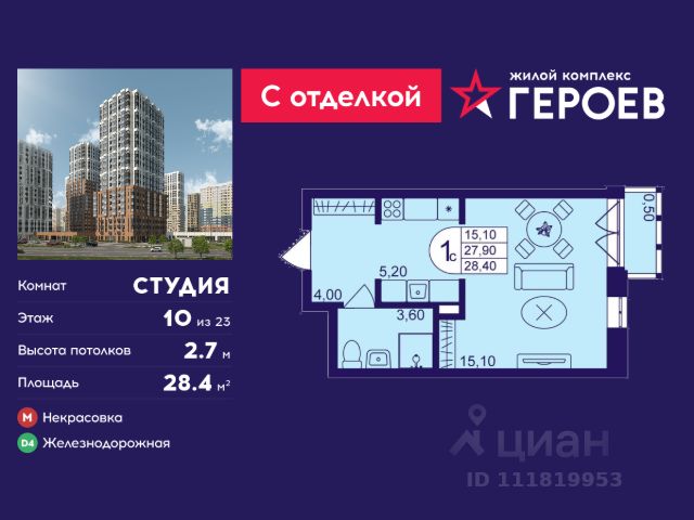 Продаётся студия 28.4 кв. м. в жилом комплексе "Героев" в Балашихе, Железнодорожный. Квартира расположена на 10 этаже 611 корпуса. Все квартиры представлены с чистовой отделкой. Вам не нужно тратить время и дополнительные финансы на ремонт или жить в шуме строительных работ - достаточно перевести свои вещи, расставить мебель и всё готово! Жилой квартал "Героев" - это уютный проект для семей с детьми. Всего 40 минут до центра Москвы. В квартале созданы все условия для досуга всех возрастов: игровые и спортивные площадки, места для отдыха и прогулок, магазины, кафе и пункты выдачи. За 15 минут можно дойти от дома до Ольгинского лесопарка - популярного места для прогулок и отдыха на свежем воздухе. Здесь приятно гулять всей семьёй, заниматься спортом или устроить пикник в выходной день. Преимущества: Квартира с готовой отделкой. Пространство полностью подготовлено для жизни: не нужно тратить время и деньги на ремонт или ждать его окончания. После получения ключей достаточно расставить мебель - и можно сразу заезжать и жить. Продуманные и светлые планировки. Просторные кухни-гостиные создают комфортное пространство для отдыха и встреч с близкими. В квартирах предусмотрены удобные гардеробные, благодаря чему легко поддерживать порядок и не перегружать комнаты шкафами. Увеличенное остекление. Большие окна наполняют квартиру естественным светом в течение всего дня, создавая ощущение простора и уюта, а также визуально расширяя пространство и делая интерьер более воздушным. Пешая доступность до станции Железнодорожная (МЦД-4) - дорога займёт не более 30 минут до центра Москвы: станции метро "Курская", "Площадь Ильича" или ТПУ Нижегородская.