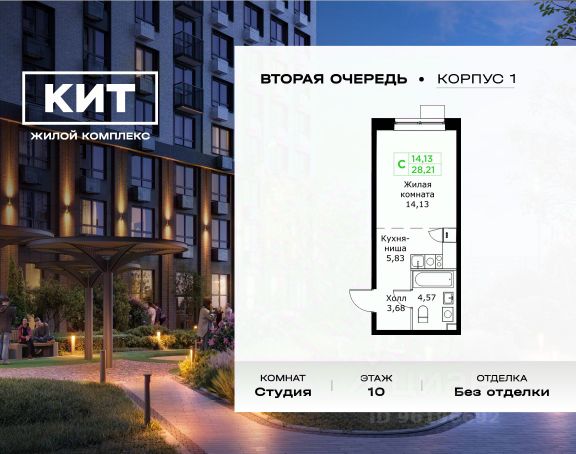 Продаётся студия 28.21 кв.м. без отделки в ЖК "КИТ2" на 10-м этаже 25 этажного дома.Жилой комплекс "Кит 2" спроектирован в урбанистической концепции "Город в Городе". Объект бизнес-класса предлагает рациональный подход к набору опций, необходимых для гармоничной жизни. Проект представляет собой два корпуса, которые образуют единую приватную территорию. Ее доминантой является двор с красивым ландшафтным дизайном и различными зонами, ориентированными на интересы жителей разного возраста. При создании пространства в приоритет ставился комфорт жителей. В шаговой доступности находятся: торговый центр, рестораны, кинотеатры, спортивный зал, образовательные учреждения и множество других объектов в сфере услуг. Преимущества проекта: - 3 корпуса для приватной жизни - Видовые характеристики (просматриваются Москва - Сити и Останкинская телебашня) - Широкая квартирография по всем типам квартир - Увеличенное остекление - 3 варианта отделки: БОРДО, СТОКГОЛЬМ, ОСЛО - Богатая развлекательная инфраструктура - Высокий уровень безопасности территории Расположение комплекса: - 2,2 км до Волковского шоссе - 2,8 км до Ярославского шоссе - 5,7 км до МКАД - 5 минут пешком до ж/д станции "Мытищи" и Автовокзала - 18 минут до станции метро "Комсомольская" - 30 минут до станции метро "Медведково"