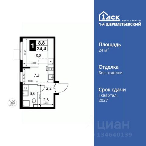 Продаётся квартира-студия номер 1273 общей площадью 23.6 кв.м. на 10-м этаже 17 этажного здания. Без отделки.