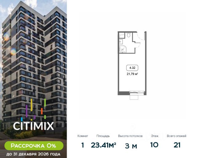 Продаётся студия в корпусе 4, общей площадью 21.57 м², на 10 этаже. Строительство корпуса завершено. Срок ввода — июль 2026 года. В 2026 году запланирован перевод корпуса в жилой фонд, что позволит собственникам оформить постоянную регистрацию в Москве. МФК "CITIMIX" — студии комфорт-класса, расположенные в районе Тропарёво-Никулино в Западном административном округе Москвы. Комплекс включает в себя пять 21-этажных корпусов и собственный парк между ними. Архитектурный облик комплекса, разработанный бюро "ADM", выполнен в современном стиле, а для наружной отделки, уникальной для каждого здания, использовались керамогранитные плиты разных оттенков, витражное остекление и натуральный камень. Все студии в новостройке оснащены современным оборудованием, включая счетчики с возможностью автоматического сбора данных. Во всех подъездах спроектированы уютные лобби-зоны и индивидуальные кладовые. Наличие обширного паркинга, где могут разместиться более 650 автомобилей, позволит закрыть зеленый дворик новостройки для проезда машин и обеспечить жителям уютное, комфортное пространство для семейного отдыха. Первые этажи займут коммерческие помещения, предназначенные для социально-бытовых объектов. В 10 минутах ходьбы расположен парк Школьников, на территории которого есть Очаковские пруды и протекает река Очаковка. В пешей доступности расположен еще один зеленый массив - Тропарёвский лесопарк, занимающий площадь в 218 га. Здесь проложены дорожки для велосипедистов, роллеров и бегунов, обустроены детские площадки и зоны отдыха. Рядом с комплексом находятся детские сады, школа, медклиника, центр развития ребенка, магазины, кафе и отделения банков. Идеальный вариант для студентов, т.к. City-комплекс расположен с такими университетами, как: РАНХиГС, РУДН, РТУ МИРЭА и РНИМУ им. Н.И. Пирогова. МФК "CITIMIX" находится в 1,5 км от станции метро "Озерная" и 2,4 км от станции метро "Юго-Западная. Автомобилистам будет удобно воспользоваться выездом на МКАД (3,2 км). Застройщиком квартала выступает компания APSIS GLOBE, основанная в 2008 году. В качестве девелопера компания успешно завершила ряд инфраструктурных, коммерческих объектов на территории Московской области, Москвы, Санкт-Петербурга.