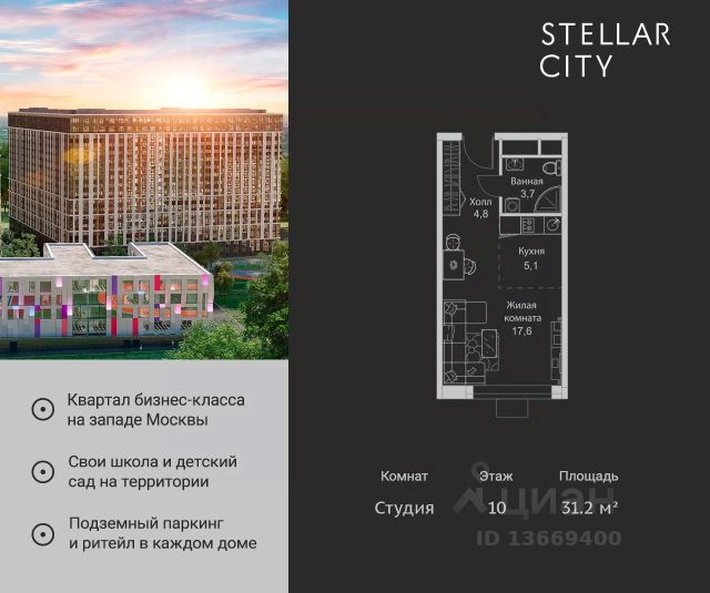 Прямая продажа от застройщика. Продаётся студия общей площадью 22.20 м² с предчистовой отделкой в ЖК VEER на 10-м этаже 22 этажного дома. Жилой комплекс бизнес-класса VEER от компании MR — это футуристичный мультиквартал, расположенный в престижной локации на западе Москвы. Благодаря переменной высоте башен — двух 22-этажных, 46-этажной и двух 59-этажных — возникает динамичность в силуэте комплекса, а его яркий образ вносит разноплановость в архитектурный пейзаж района. Расположение и транспортная доступность: • VEER удобно расположен в непосредственной близости от Кутузовского проспекта, обеспечивая быстрый доступ к центральным районам Москвы • Комплекс находится непосредственно напротив самого большого природного заказника в Москве - парка "Долина реки Сетунь", а за семь минут можно доехать до памятника садово-паркового искусства, Троекуровского леса. • Всего в 15 минутах - центр города, самая престижная бизнес-школа управления России "Сколково", дом творчества "Переделкино". • 18 минут пешком до м. "Давыдково" • Открытие новых станций метро в шаговой доступности в будущем Инфраструктура: Разнообразить свой день резиденты VEER смогут также проводя больше времени на свежем воздухе. Двор разделен на 4 зоны разных эмоций и действий, которые пересечены и соединены веерными прогулочными маршрутами: • Спортивная площадка устроена в глубине "Кленовой рощи" • В "Чайном домике" будет создан навес с утеплением для отдыха в любую погоду • Площадки для детей воплотятся в "Волшебный лес" с цветами, зеркалами и световым дизайном • "Центральная площадь" устроена у водного оазиса живописного пруда. Компания MR предлагает своим клиентам специальные условия приобретения квартир в рамках программ ипотечного кредитования от банков-партнеров.