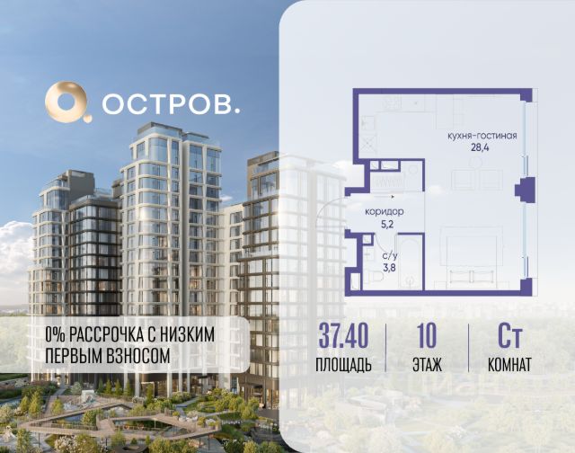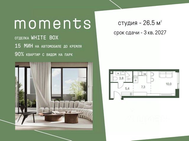 Расположена в корпусе 1 на 10м этаже. Общая площадь — 26,5 м², есть лоджия. Посмотрите фото планировки - отличная квадратная площадь, удобная для зонирования. Перегородка - и вот полноценная однокомнатная квартира.