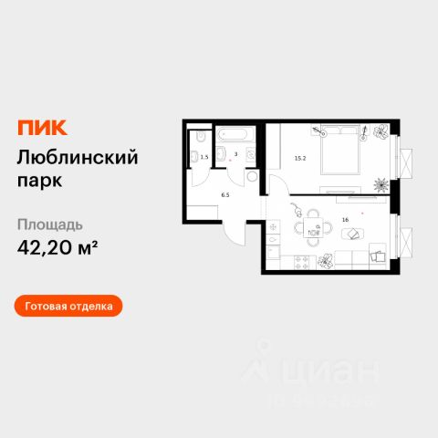 Проектная площадь с учетом лоджии составляет 66.18 м², жилая: комната 1-16,85 м², комната 2-15,98 м², лоджия- 3,90 м².