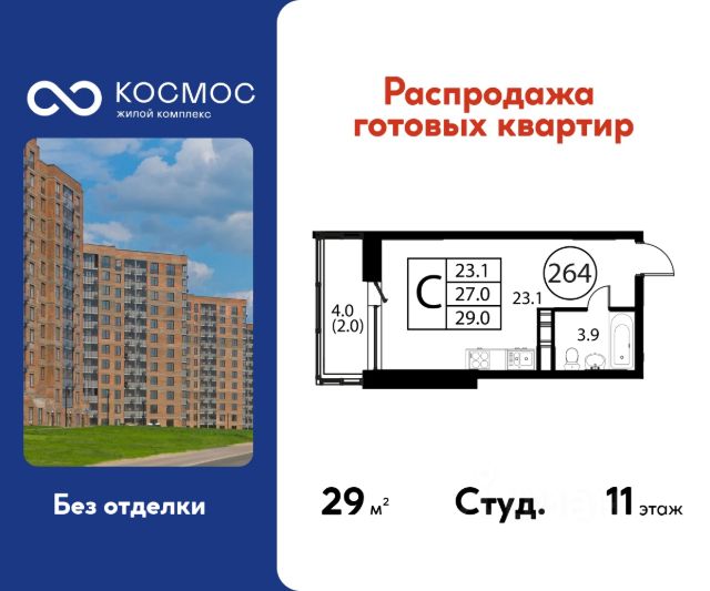 Продаётся студия в сданном доме (Корпус 3), срок сдачи: 2-кв. 2025, общей площадью 29.00 кв.м., на 11 этаже. ЖК "Космос" - новое место для жизни, в котором сочетаются отличная экология, удобное расположение, креативные решения архитектуры и функциональные планировки квартир. Строительство жилого комплекса ведётся при проектном финансировании Сбербанка. ЖК "Космос" расположен в микрорайоне Авиационный (Домодедово), в 24 километрах от МКАД по Каширскому шоссе. Проект будет состоять из 7 корпусов высотой 12 этажей. На первых этажах домов запланировано открытие необходимых для жителей объектов торговой и социальной инфраструктуры, в том числе магазинов, кафе, медицинского центра. В микрорайоне Авиационный также есть всё необходимое для комфортной жизни - здесь находятся детские сады, школы, высшие учебные заведения, магазины, поликлиники и медицинские центры, спортивный клуб, ТЦ "Торговый город". Помимо этого, жители ЖК "Космос" смогут пользоваться развитой инфраструктурой г.о. Домодедово - до него можно добраться за 20 минут на автомобиле или электричке. Одна из особенностей ЖК "Космос" - отличное экологическое состояние локации. В 10 минутах ходьбы от комплекса находится благоустроенный парк "Взлёт" с красивым прудом Лесным, здесь планируется дальнейшее благоустройство территории. Рядом с "Космосом", на площади Гагарина, будут проходить городские мероприятия. Проект отличается удобной транспортной доступностью - до МКАД можно добраться за 20-25 минут. Около жилого комплекса находятся остановки общественного транспорта, в пешей доступности - ж/д станция "Авиационная" Павелецкого направления. На придомовой территории ЖК "Космос" предусмотрено устройство парковочных мест численностью 544 машино-места, в том числе для маломобильных групп населения.