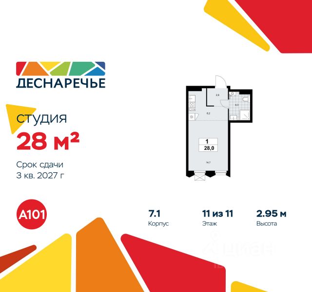Продается студия 175 в новостройке ЖК "Деснаречье" по адресу Москва, ТиНАО, Новомосковский АО, Десеновское С/П, Десна деревня, Москва, район Троицк, ЖК Деснаречье, к. 7.1. Общая площадь квартиры - 29.20 кв. м., этаж 11 из 14, секция 3. Тип проекта, по которому построен дом - монолит, компания-застройщик - ООО "А101". Стоимость квартиры - 12988744 Р. Срок сдачи - 3 квартал 2027. ПРЕДЛОЖЕНИЯ ОТ ЗАСТРОЙЩИКА В ФЕВРАЛЕ 2026: Скидки до 10% на все квартиры. Только в офисах продаж до 28 февраля. Ипотека от 13,9 % для всех! На весь срок. "Семейная ипотека" вернулась. Ставка от 3,5 % на весь срок! Без удорожания! Выгодное ипотечное комбо: Ипотека от 2200 р./мес. и от 6 % после рождения ребёнка! Ипотека для всех "Держи пять!" - ставка 5 % на 2 года! *более подробную информацию по скидкам и акциям уточняйте в отделе продаж Масштабный ЖК "Деснаречье" состоит из 3 районов ("Парк", "Река" и "Лес") в живописном природном окружении - на берегах двух рек. На территории каждого района появится собственная развёрнутая инфраструктура и уникальное благоустройство: скверы, спортивные и игровые площадки, пешеходные и велосипедные маршруты. До станции метро "Десна" (открытие запланировано на 2027 год) - всего 10 минут пешком от района. На автомобиле до ст. метро "Ольховая" и "Прокшино" - 12 минут. "Фаст-трек" свяжет "Деснаречье" со спортивно-событийным кластером и бизнес-кварталом "Прокшино". В пешей доступности и на первых этажах домов откроются: супермаркеты, школы, детские сады, спортивная школа, медицинские клиники, кафе, пространства для досуга и развития детей и взрослых. Уже сейчас доступна действующая инфраструктура соседней локации. Это настоящий "15-минутный город", когда всё рядом. Для активного и созерцательного отдыха - живописные прогулочные территории в лесу, благоустроенные зоны вдоль рек Незнайка и Десна с пирсом и лодочной станцией, ФОК, термальный комплекс с бассейном. Закрытые дворы с системой контроля доступа свободны от машин, оснащены качественным спортивным и игровым оборудованием. Преимущества "Деснаречья": - ст. метро "Десна" (2027 год) - пешая доступность - 2 реки, природный парк, лесной массив - "15-минутный город" - вся инфраструктура рядом с домом - школы и детские сады, спортивная школа