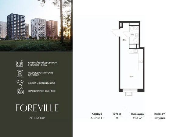 Предчистовая отделка в подарок! Пешая доступность от метро и московская прописка! Продается уютная 1-комн. квартира площадью 24,8 кв.м на 11 этаже 17 этажного жилого комплекса бизнес-класса Foreville от 3S Group. Общая площадь: 24,8 кв.м., жилая: 11,6 кв.м., площадь кухни-гостиной: 5,9 кв.м., высота потолков: 2,72 м., окна выходят на улицу. [1] Квартира предлагается без отделки, что идеально подходит для воплощения собственного дизайнерского решения. Также доступна опция предчистовой отделки, стоимость которой включается в общую цену квартиры. О проекте: Пространство Комплекс располагает крупнейшим приватным двор-парком в Новой Москве площадью 1,2 Га, предлагая жителям огромное пространство для отдыха, спорта и игр на свежем воздухе. Природный ландшафт Внутренний лесопарк с более чем 183 взрослыми деревьями и 10 320 цветущими кустарниками создает уникальную природную атмосферу для каждого времени года. Игровые и спортивные зоны Обширные площадки с безопасным покрытием, специализированные зоны для детей разных возрастных групп и взрослых, включая воркаут и настольный теннис, способствуют активному и здоровому образу жизни. Экологичность и долговечность Использование натуральных материалов, таких как лиственница, и крупноформатной бетонной плитки для покрытия, подчеркивает стремление проекта к экологичности и устойчивости. Безопасность и уединение Внутренний двор без машин обеспечивает безопасность для детей и спокойствие для взрослых. Территория огорожена и находится под круглосуточным видеонаблюдением. Сохранение времени Благодаря превосходной транспортной доступности и близости к новой станции метро Корниловская, Foreville позволяет жителям экономить время для семьи и отдыха на природе, минимизируя необходимость длительных поездок. Foreville не просто жилье, а целая экосистема для комфортной и гармоничной жизни на свежем воздухе, совмещая преимущества городской инфраструктуры и непосредственную близость к природе.