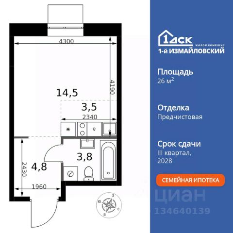 • ИПОТЕКА 10% ДЛЯ ВСЕХ БЕЗ НАЦЕНОК • ДОСТУПНО ПО СЕМЕЙНОЙ ИПОТЕКЕ Прямая продажа от застройщика! Жилой Комплекс Комфорт класса. Продаётся квартира-студия номер 365 общей площадью 26.8 кв.м. на 11-м этаже 12 этажного здания. Отделка Whitebox. Цена с учётом скидки. Особенности квартиры: - Линейная планировка - максимальная функциональность и удобство. - Можно оборудовать рабочее место - комфорт для работы и учёбы. - Линейная кухня - функциональность и практичность в одном решении. - Ниша под шкаф - компактное и удобное место для вещей. Квартира с предчистовой отделкой (White box). Вам не придется заниматься черновыми и трудоёмкими работы, а чистовую отделку и дизайн - сделайте на свой вкус. Информация о комплексе: Современный архитектурный проект "1-й Измайловский" - идеальное место для проживания, расположенное в восточной части Москвы в окружении 14 000 гектаров леса. Комплекс пронизан атмосферой здорового образа жизни и благополучия. Сиреневый сад и близлежащие лесопарки - это места, где можно насладиться лыжными прогулками зимой и тонизирующими пробежками летом. Расположенный между Щелковским шоссе и Амурской улицей, "1-й Измайловский" осмысляет себя не столько через близость к городским точкам притяжения, сколько через соседство с зелеными пространствами и спортивными объектами. Он отгорожен от шоссе застройкой первой линии и собственными садами здоровья. В его окнах - изумрудное море парка "Лосиный остров" и густые кроны окрестных дворов. В его графике - занятия спортом и прогулки в Измайлове. Транспортная доступность: Не более 2,5 км до станций метро "Щёлковская" и "Черкизовская" и МЦК "Локомотив". Щёлковское шоссе соединяет квартал с Северо-восточной хордой и МКАД, Центральным автовокзалом и Восточным железнодорожным вокзалом. Две автобусные остановки в паре минут ходьбы и 11 маршрутов общественного транспорта. На автомобиле 3 минуты до СВХ 12 минут до ТТК 15 минут до Садового кольца Внутренняя инфраструктура: Комплекс находится в исторически сложившемся районе Москвы с хорошим качеством и плотностью инфраструктуры. Торговые центры и сетевые магазины -6 детских садов, включая собственный детский сад на 125 мест -3 школы, включая собственную школу -Поликлиники и медицинские центры -Парки и зоны отдыха Расположение архитектурного проекта создает все условия для тех, кто стремится к здоровому образу жизни и для тех, кто уже сделал выбор в его пользу. В ближайшем окружении расположены несколько стадионов и множество спортивных объектов для занятий спортом на любой вкус: от всеми любимого футбола, баскетбола и до конного спорта. В окружении проекта более 30 километров организованных беговых и велодорожек.