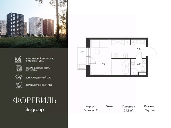 Продается квартира-студия с отделкой в 9 фазе города-парка "Первый Московский". Общая площадь квартиры - 26,4 кв. м, этаж 11 из 19. Срок сдачи - 2 квартал 2027 года. Тип дома - монолитный. ТОЛЬКО ДО 31 МАРТА выгодные условия на приобретение квартиры в ипотеку или рассрочку. Звоните - и мы подберем оптимальное предложение под ваш запрос! Корпус состоит из 3 секций. Город-парк "Первый Московский" расположен всего в 7 км по Киевскому шоссе от МКАД на территории Новой Москвы. Из города-парка прямой выезд на Киевское шоссе и трассу Солнцево-Бутово-Варшавское шоссе. ТРАНСПОРТНАЯ ДОСТУПНОСТЬ: - 5 мин. на личном автомобиле или 10 мин. на автобусе 189, 147, 193 до станции метро "Филатов Луг" - 5 мин. на личном автомобиле или 12 мин. на автобусе 863 до станции метро "Саларьево" - 6 мин. на личном автомобиле или 15 мин. на автобусе 333 до станции метро "Рассказовка" РАЗВИТАЯ ИНФРАСТРУКТУРА В ОКРУЖЕНИИ: - общеобразовательная школа 2120 (корпуса д1, д7, ш1-ш5) - детский сад 2120 (корпуса д2, д9) - школа искусств - городская больница, детская поликлиника, филиал 5 - подстанция скорой помощи 58 и пожарно-спасательный центр 313 - отдел полиции, отдел ГИБДД - торговые центры "Столица" и "Новомосковский" - стадион, каток, бассейн - кафе, продуктовые магазины, аптеки, фитнес-центры, салоны красоты и пр. БЛАГОУСТРОЙСТВО: - дворы без машин - разнообразные детские площадки и развивающие комплексы - детские площадки разделены по возрастным группам - максимальная близость корпуса к парку "Филатов луг" - озеленение территории с учетом зонирования, островками для отдыха ОСОБЕННОСТИ АРХИТЕКТУРЫ: - безбарьерные входные группы - велопарковка на -1 этаже - колясочные в каждой входной группе - коммерческие помещения на 1 этаже в трех секциях - кладовые помещения расположены на жилых этажах и на -1 этаже - в каждой секции корпуса - 4 лифта: 2 пассажирских, 2 грузовых - видеонаблюдение установленное в холлах первых этажей, у подъездов и на прилегающей территории АВТОРСКИЙ ДИЗАЙН: Входные группы выполнены по авторскому дизайну, оснащены системой "тёплый пол". В каждой входной группе будет располагаться комфортабельная зона ожидания, почтовые ящики с ячейкой для спама, колясочная, акцентные пуфы и столик.