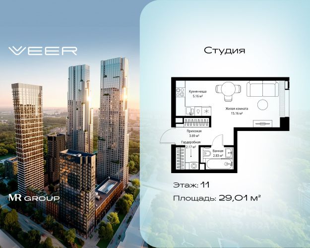 Старт продаж новой очереди! Продаётся студия общей площадью 28.19 м² без отделки в ЖК VEER на 11-м этаже 25 этажного дома. VEER.2 — вторая очередь футуристичного квартала бизнес-класса VEER. Это новая экосистема в престижном Западном округе Москвы, поражающая масштабностью внутренней инфраструктуры. ЖК находится всего в 5 минутах от Кутузовского проспекта и в 15 минутах от Сколково. Ансамбль из четырех стеклянных башен с доминантой в 237 метров разработан по принципу современного урбанизма и выражен в лаконичных объемах — параллелепипедах со сглаженными углами, которые придают зданиям утонченный вид. Расположение и транспортная доступность: • Образовательный комплекс в составе топовой школы, состоящий из двух зданий: основное на 1500 школьных и 450 дошкольных мест, отдельное здание детского сада на 300 мест. • Парк "Долина реки Сетунь" площадью более 700 гектаров • Рядом МГУ, МГИМО, РАНХиГС и Академия ФСБ • 15 минут по Кутузовскому проспекту до ужина в центре с видом на Москву-реку • 18 минут пешком до м. "Давыдково" • Открытие новых станций метро в шаговой доступности в будущем Инфраструктура: Двор в VEER.2 — это ассиметричные холмы, каменные "лабиринты", зеленые ковры и хвойные островки с единой живой экосистемой. Здесь есть все: • Павильон умиротворения Место отдыха под навесом в спокойной части двора, окруженное деревьями. • Активная тропа Тактильная дорога из камней разного диаметра для расслабляющих прогулок. • Бизнес-гарден Оборудованное пространство для работы на свежем воздухе со столом и встроенными розетками. • Детская площадка Двухуровневая площадка "Ботаника" с песочницей, переговорной трубой и горкой "Дружба". Компания MR предлагает своим клиентам специальные условия приобретения квартир в рамках программ ипотечного кредитования от банков-партнеров.