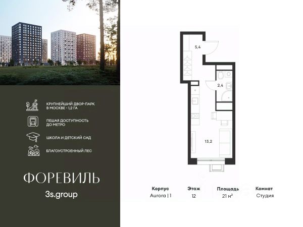 Пешая доступность от метро и московская прописка! Продается уютная студия площадью 21 кв.м на 12 этаже 17 этажного жилого комплекса бизнес-класса Foreville от 3S Group. Общая площадь: 21 кв.м., жилая: 6,9 кв.м., площадь кухни-гостиной: 6,3 кв.м., высота потолков: 2,72 м., окна выходят во двор. Квартира предлагается без отделки, что идеально подходит для воплощения собственного дизайнерского решения. Также доступна опция предчистовой отделки, стоимость которой включается в общую цену квартиры. О проекте: Пространство Комплекс располагает крупнейшим приватным двор-парком в Новой Москве площадью 1,2 Га, предлагая жителям огромное пространство для отдыха, спорта и игр на свежем воздухе. Природный ландшафт Внутренний лесопарк с более чем 183 взрослыми деревьями и 10 320 цветущими кустарниками создает уникальную природную атмосферу для каждого времени года. Игровые и спортивные зоны Обширные площадки с безопасным покрытием, специализированные зоны для детей разных возрастных групп и взрослых, включая воркаут и настольный теннис, способствуют активному и здоровому образу жизни. Экологичность и долговечность Использование натуральных материалов, таких как лиственница, и крупноформатной бетонной плитки для покрытия, подчеркивает стремление проекта к экологичности и устойчивости. Безопасность и уединение Внутренний двор без машин обеспечивает безопасность для детей и спокойствие для взрослых. Территория огорожена и находится под круглосуточным видеонаблюдением. Сохранение времени Благодаря превосходной транспортной доступности и близости к новой станции метро Корниловская, Foreville позволяет жителям экономить время для семьи и отдыха на природе, минимизируя необходимость длительных поездок. Foreville не просто жилье, а целая экосистема для комфортной и гармоничной жизни на свежем воздухе, совмещая преимущества городской инфраструктуры и непосредственную близость к природе.