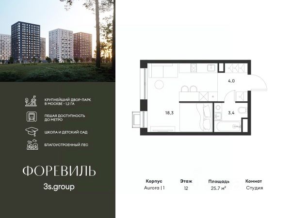 Пешая доступность от метро и московская прописка! Продается уютная 1-комн. квартира площадью 25,7 кв.м на 12 этаже 17 этажного жилого комплекса бизнес-класса Foreville от 3S Group. Общая площадь: 25,7 кв.м., жилая: 12,3 кв.м., площадь кухни-гостиной: 5,9 кв.м., высота потолков: 2,72 м., окна выходят во двор. Квартира предлагается без отделки, что идеально подходит для воплощения собственного дизайнерского решения. Также доступна опция предчистовой отделки, стоимость которой включается в общую цену квартиры. О проекте: Пространство Комплекс располагает крупнейшим приватным двор-парком в Новой Москве площадью 1,2 Га, предлагая жителям огромное пространство для отдыха, спорта и игр на свежем воздухе. Природный ландшафт Внутренний лесопарк с более чем 183 взрослыми деревьями и 10 320 цветущими кустарниками создает уникальную природную атмосферу для каждого времени года. Игровые и спортивные зоны Обширные площадки с безопасным покрытием, специализированные зоны для детей разных возрастных групп и взрослых, включая воркаут и настольный теннис, способствуют активному и здоровому образу жизни. Экологичность и долговечность Использование натуральных материалов, таких как лиственница, и крупноформатной бетонной плитки для покрытия, подчеркивает стремление проекта к экологичности и устойчивости. Безопасность и уединение Внутренний двор без машин обеспечивает безопасность для детей и спокойствие для взрослых. Территория огорожена и находится под круглосуточным видеонаблюдением. Сохранение времени Благодаря превосходной транспортной доступности и близости к новой станции метро Корниловская, Foreville позволяет жителям экономить время для семьи и отдыха на природе, минимизируя необходимость длительных поездок. Foreville не просто жилье, а целая экосистема для комфортной и гармоничной жизни на свежем воздухе, совмещая преимущества городской инфраструктуры и непосредственную близость к природе.