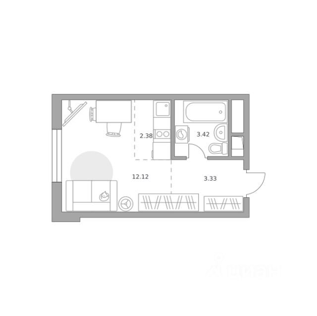 Продаётся студия 385, площадью 26,18 м², на 12 этаже в ЖК "Аникеевский" корпус 1.2. Стоимость — от 5716213 руб. Квартира без отделки, планировка односторонняя, окна во двор.