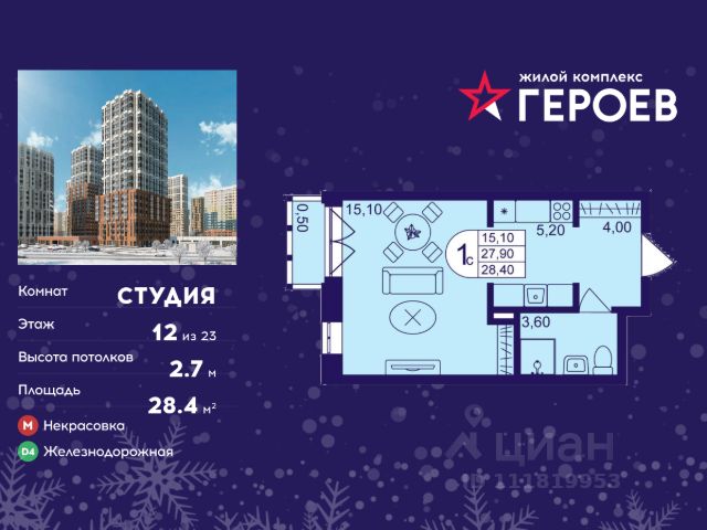 Расположенная по адресу: г. Люберцы, мкр-н Зенино ЖК Самолёт, ул. Барыкина, 4, 12/17 этажность. Общая площадь 26. 3 м2.