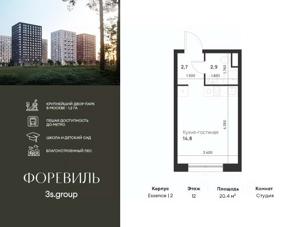 Предчистовая отделка в подарок! Пешая доступность от метро и московская прописка! Продается уютная студия площадью 20,4 кв.м на 12 этаже 17 этажного жилого комплекса бизнес-класса Foreville от 3S Group. Общая площадь: 20,4 кв.м., жилая: 9,8 кв.м., площадь кухни-гостиной: 5,9 кв.м., высота потолков: 2,72 м., окна выходят на улицу. Квартира предлагается без отделки, что идеально подходит для воплощения собственного дизайнерского решения. Также доступна опция предчистовой отделки, стоимость которой включается в общую цену квартиры. О проекте: Пространство Комплекс располагает крупнейшим приватным двор-парком в Новой Москве площадью 1,2 Га, предлагая жителям огромное пространство для отдыха, спорта и игр на свежем воздухе. Природный ландшафт Внутренний лесопарк с более чем 183 взрослыми деревьями и 10 320 цветущими кустарниками создает уникальную природную атмосферу для каждого времени года. Игровые и спортивные зоны Обширные площадки с безопасным покрытием, специализированные зоны для детей разных возрастных групп и взрослых, включая воркаут и настольный теннис, способствуют активному и здоровому образу жизни. Экологичность и долговечность Использование натуральных материалов, таких как лиственница, и крупноформатной бетонной плитки для покрытия, подчеркивает стремление проекта к экологичности и устойчивости. Безопасность и уединение Внутренний двор без машин обеспечивает безопасность для детей и спокойствие для взрослых. Территория огорожена и находится под круглосуточным видеонаблюдением. Сохранение времени Благодаря превосходной транспортной доступности и близости к новой станции метро Корниловская, Foreville позволяет жителям экономить время для семьи и отдыха на природе, минимизируя необходимость длительных поездок. Foreville не просто жилье, а целая экосистема для комфортной и гармоничной жизни на свежем воздухе, совмещая преимущества городской инфраструктуры и непосредственную близость к природе.