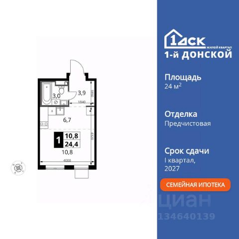 ДОПОЛНИТЕЛЬНАЯ СКИДКА ДО 10% В ОФИСЕ ПРОДАЖ! Прямая продажа от застройщика! Жилой Комплекс класса Комфорт Плюс. Продаётся квартира-студия номер 840 общей площадью 24.9 кв.м. на 13-м этаже 24 этажного здания. Отделка Whitebox. Особенности квартиры: - МЦД-5 в пешей доступности - Квартал с собственной набережной - Свои 2 детских сада и школа - Линейная планировка - максимальная функциональность и удобство. - Ниша под шкаф - компактное и удобное место для вещей. Квартира с предчистовой отделкой (White box). Вам не придется заниматься черновыми и трудоёмкими работы, а чистовую отделку и дизайн - сделайте на свой вкус. Информация о комплексе: Комплекс 1-й Донской расположен в 7 км от МКАД по трассе М-4 Дон. В нем сочетаются все плюсы комфортной городской среды и природного окружения. В проекте достаточно большой процент квартир, выходящих на 2-3 стороны света. Секции-маяки формируют у зданий визуальную L-форму, что придает застройке структуру и ритмику объемов. На ощущение динамики работает и разная этажность зданий. Теплая цветовая палитра фасадов отражает природу Дона. Вечерами дома преображаются благодаря архитектурной подсветке, выгодно выделяясь на городском фоне. Природа оказывает положительное влияние на человека на всех уровнях восприятия: через зрение, запахи, звуки, тактильные ощущения. Неподалеку от ЖК Первый Донской: Ермолинский парк, Видновский лесопарк, Жуковский парк Транспортная доступность: Комплекс удобно расположен в 7 км от МКАД по трассе М-4 Дон (через Видное). Расстояние до Каширского шоссе составляет 12 км. Добраться до метро и центра Москвы позволяет развитая сеть маршрутов общественного наземного транспорта. Действующая ж/д станция Калинина Павелецкого направления в 15-17 минутах ходьбы (МЦД-5 в 2025-2026 гг). Внутренняя инфраструктура: Проект 1-й Донской соседствует с бурно развивающимся районом, основная инфраструктура которого уже сложилась. В строительстве современных жилых комплексов в округе есть свои плюсы: здесь формируется продуманная и комфортная городская среда. Что касается внутренней инфраструктуры, на территории квартала будут расположены собственные муниципальные 2 детских садика и школа, которые помогут совместить приятное с полезным. Территория комплекса пронизана целой сетью живописных пешеходных маршрутов, позволяющих попасть в любой уголок района. Основные пути, как водится, "торговые". Они проходят вдоль магазинов, кафе и других представителей коммерции и отделяются от проезжей части зеленой "фито" - стеной. Среди крупных социальных объектов предусмотрены своя поликлиника и торговый центр с примыкающей площадью для общественных мероприятий. Уют начинается с продуманного подъезда. Сквозные подъезды наполнены светом благодаря сплошному остеклению. Вход в них есть и с улицы, и со двора.