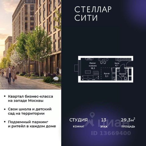 Продается квартира от надежного застройщика Tashir Estate в квартале бизнес-класса Stellar City в ЗАО Москвы. Площадь квартиры составляет: 31.6 кв. м, потолки: 3.1 м Квартира находится на 13 этаже, 4 корпуса жилого квартала Stellar City — микрогорода будущего на орбите Москвы. Stellar City — квартал в ЗАО Москвы вблизи инновационного центра Сколково. В окружении — 11 парков и природных зон, в том числе Долина реки Сетунь, Мещерский лес и парк развлечений The Rink. Город в городе Чтобы дом и инфраструктура вокруг отвечала динамичному лайфстайлу жителя мегаполиса, в основу проекта легла концепция город в городе, которая позволяет решать все бытовые вопросы in-home. В квартале будут возведены школа и детский сад, воркаут-зоны, променад, вело и беговые дорожки, детские площадки для каждого корпуса, а также коммерция на первых этажах для ежедневных покупок. Все необходимое — на расстоянии нескольких шагов. Изящные и лаконичные лобби Авторский дизайн, натуральные материалы в отделке и безупречный интерьер вне времени. Лобби и холлы в проекте бизнес-класса Stellar City ничем не отличаются от входных групп в премиум-сегменте благодаря качественным европейским материалам в отделке, стильному дизайну, консьерж-сервису и уютной зоне ожидания с журнальными столиками и мягкой мебелью. Комфорт и безопасность Закрытая территория, охрана, система СКУД, специально разработанное мобильное приложение дома для резидентов и подземный паркинг с круглосуточным наблюдением и доступом с помощью автоматического считывания номера авто.