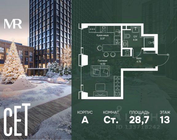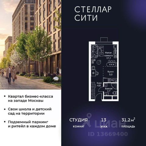 Продается квартира от надежного застройщика Tashir Estate в квартале бизнес-класса Stellar City в ЗАО Москвы. Площадь квартиры составляет: 31.2 кв. м, потолки: 3.1 м Квартира находится на 13 этаже, 4 корпуса жилого квартала Stellar City — микрогорода будущего на орбите Москвы. Stellar City — квартал в ЗАО Москвы вблизи инновационного центра Сколково. В окружении — 11 парков и природных зон, в том числе Долина реки Сетунь, Мещерский лес и парк развлечений The Rink. Город в городе Чтобы дом и инфраструктура вокруг отвечала динамичному лайфстайлу жителя мегаполиса, в основу проекта легла концепция город в городе, которая позволяет решать все бытовые вопросы in-home. В квартале будут возведены школа и детский сад, воркаут-зоны, променад, вело и беговые дорожки, детские площадки для каждого корпуса, а также коммерция на первых этажах для ежедневных покупок. Все необходимое — на расстоянии нескольких шагов. Изящные и лаконичные лобби Авторский дизайн, натуральные материалы в отделке и безупречный интерьер вне времени. Лобби и холлы в проекте бизнес-класса Stellar City ничем не отличаются от входных групп в премиум-сегменте благодаря качественным европейским материалам в отделке, стильному дизайну, консьерж-сервису и уютной зоне ожидания с журнальными столиками и мягкой мебелью. Комфорт и безопасность Закрытая территория, охрана, система СКУД, специально разработанное мобильное приложение дома для резидентов и подземный паркинг с круглосуточным наблюдением и доступом с помощью автоматического считывания номера авто.