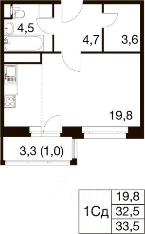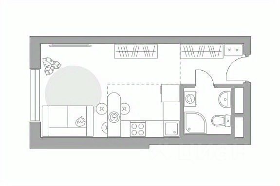 Общая площадь квартиры-студии 26,2 кв.м., а когда находишься в ней, то кажется, что она гораздо больше, чем на самом деле. И все эти ощущения из-за того, что планировка продуманная. Окна выходят во двор дома.