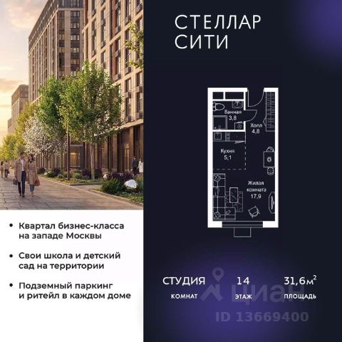 Продается квартира от надежного застройщика Tashir Estate в квартале бизнес-класса Stellar City в ЗАО Москвы. Площадь квартиры составляет: 31.2 кв. м, потолки: 3.1 м Квартира находится на 14 этаже, 4 корпуса жилого квартала Stellar City — микрогорода будущего на орбите Москвы. Stellar City — квартал в ЗАО Москвы вблизи инновационного центра Сколково. В окружении — 11 парков и природных зон, в том числе Долина реки Сетунь, Мещерский лес и парк развлечений The Rink. Город в городе Чтобы дом и инфраструктура вокруг отвечала динамичному лайфстайлу жителя мегаполиса, в основу проекта легла концепция город в городе, которая позволяет решать все бытовые вопросы in-home. В квартале будут возведены школа и детский сад, воркаут-зоны, променад, вело и беговые дорожки, детские площадки для каждого корпуса, а также коммерция на первых этажах для ежедневных покупок. Все необходимое — на расстоянии нескольких шагов. Изящные и лаконичные лобби Авторский дизайн, натуральные материалы в отделке и безупречный интерьер вне времени. Лобби и холлы в проекте бизнес-класса Stellar City ничем не отличаются от входных групп в премиум-сегменте благодаря качественным европейским материалам в отделке, стильному дизайну, консьерж-сервису и уютной зоне ожидания с журнальными столиками и мягкой мебелью. Комфорт и безопасность Закрытая территория, охрана, система СКУД, специально разработанное мобильное приложение дома для резидентов и подземный паркинг с круглосуточным наблюдением и доступом с помощью автоматического считывания номера авто.