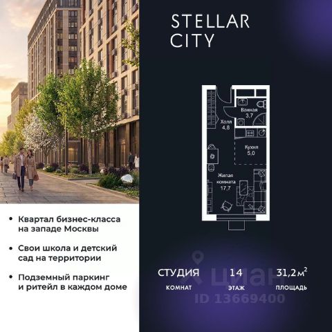 Продается квартира от надежного застройщика Tashir Estate в квартале бизнес-класса Stellar City в ЗАО Москвы. Площадь квартиры составляет: 30.1 кв. м, потолки: 3.1 м Квартира находится на 14 этаже, 4 корпуса жилого квартала Stellar City — микрогорода будущего на орбите Москвы. Stellar City — квартал в ЗАО Москвы вблизи инновационного центра Сколково. В окружении — 11 парков и природных зон, в том числе Долина реки Сетунь, Мещерский лес и парк развлечений The Rink. Город в городе Чтобы дом и инфраструктура вокруг отвечала динамичному лайфстайлу жителя мегаполиса, в основу проекта легла концепция город в городе, которая позволяет решать все бытовые вопросы in-home. В квартале будут возведены школа и детский сад, воркаут-зоны, променад, вело и беговые дорожки, детские площадки для каждого корпуса, а также коммерция на первых этажах для ежедневных покупок. Все необходимое — на расстоянии нескольких шагов. Изящные и лаконичные лобби Авторский дизайн, натуральные материалы в отделке и безупречный интерьер вне времени. Лобби и холлы в проекте бизнес-класса Stellar City ничем не отличаются от входных групп в премиум-сегменте благодаря качественным европейским материалам в отделке, стильному дизайну, консьерж-сервису и уютной зоне ожидания с журнальными столиками и мягкой мебелью. Комфорт и безопасность Закрытая территория, охрана, система СКУД, специально разработанное мобильное приложение дома для резидентов и подземный паркинг с круглосуточным наблюдением и доступом с помощью автоматического считывания номера авто.