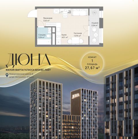 Современный жилой квартал бизнес-класса "Дюна" расположен в 10 минутах ходьбы от станции метро "Котельники" (1,2 км) на пересечении Новорязанского и Дзержинского шоссе. Квартал находится в районе с развитой инфраструктурой: в непосредственной близости расположены школы, детские сады, поликлиники, а также гипермаркеты и торговые комплексы, такие как "Metro", "Глобус", "Лемана Про" (Леруа Мерлен), "МЕГА Белая Дача", "Outlet Village Белая Дача" и другие. В шаговой доступности находятся физкультурно-оздоровительный комплекс с бассейном и теннисными кортами, а также благоустроенный лесопарк "Кузьминки" площадью 1189 га. Неподалёку расположены пляжи Дзержинских карьеров с экстрим-парком и горнолыжными трассами, Томилинский лесопарк с лыжной базой и Жулебинский лесопарк. Застройщик реализует современную урбанистическую концепцию "Город в городе", которая подразумевает наличие собственной полноценной инфраструктуры на территории жилого комплекса, включая школу, детские сады, торговую галерею, бизнес-центр, пункт полиции и медицинский центр. Общая площадь застройки составляет 12,2 га. Квартиры представлены в диапазоне планировок от студий до четырёхкомнатных, в обычном и евроформате. На этажах расположено от 3 до 4 бесшумных скоростных лифтов при количестве квартир от 4 до 7 на этаже. Квартиры сдаются с предчистовой отделкой (white box). Здания переменной этажности строятся по технологии монолит-кирпич, а фасады выполнены с использованием инновационной системы вентилируемого комбинированного фасада.Комфорт на внутренней территории обеспечивается за счёт принципа "двор без машин", системы доступа по карте и круглосуточного видеонаблюдения. Приобрести квартиру можно с использованием материнского капитала, беспроцентной рассрочки или ипотечных программ. При 100% оплате предусмотрены индивидуальные условия.