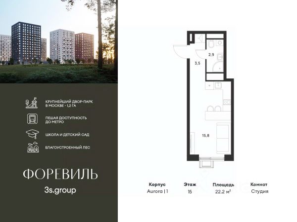 Строим кварталы для жизни с заботой о будущем. Предлагается студия комфорт-класса площадью 22,23 кв.м в корпусе 13 на 15-м этаже, в жилом комплексе "Эко Бунино". Застройщик сдает квартиры с отделкой в нескольких вариантах: предчистовая, готовая, улучшенная или вариант без нее. Последний подойдет тем, кто хочет создать свой уникальный интерьер и ничем себя не ограничивать. А если не хочется тратить время на ремонт, можно выбрать опцию — с отделкой. Перед тем как отдать ключи, застройщик установит натяжные потолки, поклеит обои под покраску, положит ламинат светлых тонов, а в санузлах — керамическую плитку и керамогранит. Приобрести квартиру возможно по специальным акциям от застройщика, с текущими условиями акций можно ознакомиться в блоке "Акций". Цена динамическая и может отличаться, уточняйте актуальность у застройщика. "Эко Бунино" — жилой комплекс в Новой Москве, полностью готовый для жизни. Уже построены школа и детские сады, открыты ледовая арена и магазины. Рядом — 2 станции метро и 3 лесопарка для прогулок. До станции метро "Новомосковская" — 20 минут пешком по экотропе. Во дворах-парках, закрытых от машин, комфортно и безопасно гулять. Здесь высажены уже взрослые деревья, которые создают прохладную тень в жаркий день. Ребенок любого возраста найдет увлекательное занятие в уже готовом плейхабе с большой горкой в виде слона и уникальным игровым оборудованием. Пока дети играют, родители могут прогуляться по бульвару или отдохнуть под навесом из растений. "Эко Бунино" — это 19 монолитных домов переменной этажности. Для облицовки используется навесной вентилируемый фасад и клинкерная плитка, которая имитирует кирпич. Переменная этажность обеспечивает хорошую инсоляцию дворов: в солнечные дни на территории особенно приятно гулять.