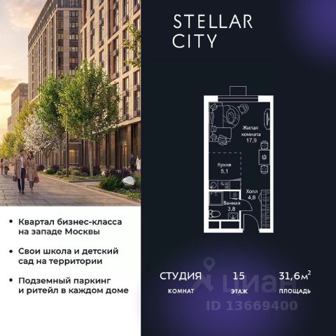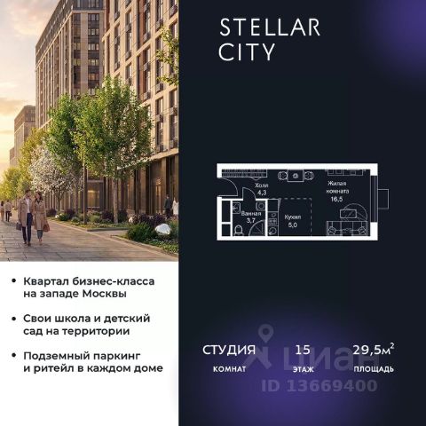 Продается квартира от надежного застройщика Tashir Estate в квартале бизнес-класса Stellar City в ЗАО Москвы. Площадь квартиры составляет: 29.3 кв. м, потолки: 3.1 м Квартира находится на 15 этаже, 4 корпуса жилого квартала Stellar City — микрогорода будущего на орбите Москвы. Stellar City — квартал в ЗАО Москвы вблизи инновационного центра Сколково. В окружении — 11 парков и природных зон, в том числе Долина реки Сетунь, Мещерский лес и парк развлечений The Rink. Город в городе Чтобы дом и инфраструктура вокруг отвечала динамичному лайфстайлу жителя мегаполиса, в основу проекта легла концепция город в городе, которая позволяет решать все бытовые вопросы in-home. В квартале будут возведены школа и детский сад, воркаут-зоны, променад, вело и беговые дорожки, детские площадки для каждого корпуса, а также коммерция на первых этажах для ежедневных покупок. Все необходимое — на расстоянии нескольких шагов. Изящные и лаконичные лобби Авторский дизайн, натуральные материалы в отделке и безупречный интерьер вне времени. Лобби и холлы в проекте бизнес-класса Stellar City ничем не отличаются от входных групп в премиум-сегменте благодаря качественным европейским материалам в отделке, стильному дизайну, консьерж-сервису и уютной зоне ожидания с журнальными столиками и мягкой мебелью. Комфорт и безопасность Закрытая территория, охрана, система СКУД, специально разработанное мобильное приложение дома для резидентов и подземный паркинг с круглосуточным наблюдением и доступом с помощью автоматического считывания номера авто.
