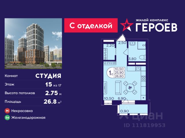 Продаётся студия 28.8 кв. м. в жилом комплексе "Героев" в Балашихе, Железнодорожный. Квартира расположена на 15 этаже 408 корпуса. Все квартиры представлены с чистовой отделкой. Вам не нужно тратить время и дополнительные финансы на ремонт или жить в шуме строительных работ - достаточно перевести свои вещи, расставить мебель и всё готово! Жилой квартал "Героев" - это уютный проект для семей с детьми. Всего 40 минут до центра Москвы. В квартале созданы все условия для досуга всех возрастов: игровые и спортивные площадки, места для отдыха и прогулок, магазины, кафе и пункты выдачи. За 15 минут можно дойти от дома до Ольгинского лесопарка - популярного места для прогулок и отдыха на свежем воздухе. Здесь приятно гулять всей семьёй, заниматься спортом или устроить пикник в выходной день. Преимущества: Квартира с готовой отделкой. Пространство полностью подготовлено для жизни: не нужно тратить время и деньги на ремонт или ждать его окончания. После получения ключей достаточно расставить мебель - и можно сразу заезжать и жить. Продуманные и светлые планировки. Просторные кухни-гостиные создают комфортное пространство для отдыха и встреч с близкими. В квартирах предусмотрены удобные гардеробные, благодаря чему легко поддерживать порядок и не перегружать комнаты шкафами. Увеличенное остекление. Большие окна наполняют квартиру естественным светом в течение всего дня, создавая ощущение простора и уюта, а также визуально расширяя пространство и делая интерьер более воздушным. Пешая доступность до станции Железнодорожная (МЦД-4) - дорога займёт не более 30 минут до центра Москвы: станции метро "Курская", "Площадь Ильича" или ТПУ Нижегородская.