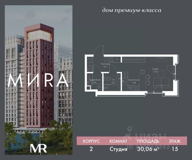 Прямая продажа от застройщика. Продаётся студия общей площадью 30.06 м² без отделки в доме премиум-класса МИRА на 15-м этаже 23 этажного дома. Квартира расположена в корпусе 2. Дом премиум-класса МИRA это: • Спокойный район с богатой историей и сложившейся инфраструктурой • Авторская архитектура на стыке классики и современности • Вход в парк прямо из жилого комплекса • Панорамные виды на Яузу, парки, ВДНХ и скульптуру "Рабочий и колхозница" • Удобные сервисы и безопасность для каждого резидента Расположение: Жилой квартал расположен в Алексеевском районе на северо-востоке Москвы, на второй линии домов, таким образом вы сможете дистанцироваться от шума и суеты проспекта Мира, но при этом будете жить недалеко от этой важной городской магистрали. Прямо у дома: • Парк Акведук • Река Яуза • Памятник "Рабочий и колхозница" Пешком: • 16 мин м. ВДНХ На автомобиле: • 12 мин ТТК • 15 мин Садовое кольцо • 12 мин Национальный парк "Лосиный остров" Благоустройство: Концепция благоустройства от бюро "ДРУЖБА" разработана в стиле "Лесная тропа". В уютном дворе расположились словно затерянные в лесу, площадки для отдыха. Они разделяются островками с травами, кустарниками, крупными камнями и деревьями, между которыми проходят узкие песчаные тропинки с деликатной подсветкой по вечерам. Центральной точкой притяжения для жителей станет главная площадь с фонтаном, которая открывается сразу из двух входных групп. Внутренний двор МИRA: • Детская площадка с зонами для игр малышей до трех лет и детей более старшего возраста • Спортивная площадка с профессиональным оборудованием для тренировок • Декоративные перголы • Воздушный арт-объект с подсветкой, похожий на облако • Чайный домик, где в отдельном отапливаемом павильоне можно в любое время года попить кофе с соседями или устроить камерное семейное чаепитие • Зоны для работы и отдыха с гамаком под навесом, скамейками и креслами Инфраструктура и окружение: В Алексеевском районе есть огромные благоустроенные парки, магазины, гимназии с высоким рейтингом и филиалы ВУЗов, частные и государственные детские сады, модные кофейни и фитнес-центры. В квартале МИRА предусмотрены: • 2 ресторана с видом на парк Акведук • 3 кафе • фитнес-студия • подземный паркинг на 330 машино-мест Компания MR Group предлагает своим клиентам специальные условия приобретения квартир в рамках программ ипотечного кредитования от банков-партнеров.