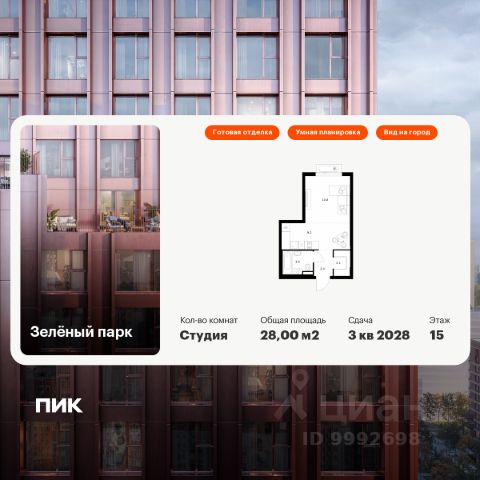 Продаётся квартира-студия площадью 28 кв.м на 15 этаже 21 этажного дома (Корпус 5.2, Секция 1) проекта ПИК Зелёный парк. Светлый просторный подъезд на уровне земли, функциональная планировка, большие окна, c отделкой. Большой квартал с оригинальной архитектурой в обжитом районе Зеленограда. От него до станции МЦД-3 "Зеленоград-Крюково" — 20 минут пешком, до Кутузовского шоссе можно доехать на машине за 3 минуты, а до Пятницкого шоссе — за 5 минут. Характер "Зелёного парка" отражён в архитектуре. Квартал состоит из уютных разноэтажных блоков с оригинальными акцентами. Цветовая палитра проекта спокойная и сдержанная: оттенки белого и коричневого сочетаются с пастельным розовым и мятным. В проекте запланированы также два детских сада, две школы и паркинг. На первых этажах откроются магазины, кафе и другие сервисы — чтобы купить кофе и свежий хлеб к завтраку, можно будет просто спуститься на лифте. В уютных дворах-парках появятся места для отдыха, детские площадки, кофейни и зоны отдыха. Рядом — Зеленоградский лес, Парк Победы и Михайловский пруд, где можно гулять и заниматься спортом. У жителей "Зелёного парка" будет возможность получить московскую прописку. Для любителей спорта в 10 минутах пешком от квартала — велодром с BMX-трассой, физкультурно-оздоровительный комплекс Горизонт, а также лыжероллерная трасса длиной около 3 км. Артикул 1030879 (Застройщик АО "СПЕЦИАЛИЗИРОВАННЫЙ ЗАСТРОЙЩИК "ЗЕЛЕНОГРАДСКИЙ")