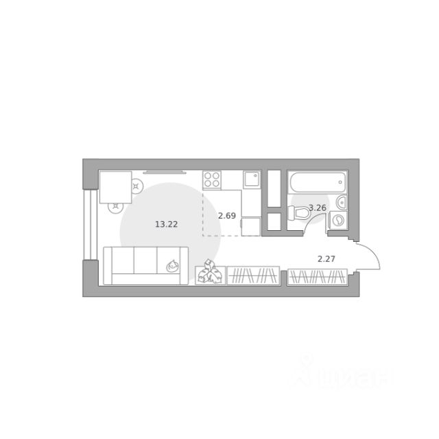 Продаётся студия 686, площадью 25,98 м², на 17 этаже в ЖК "Ильинойс" корпус 3. Стоимость — от 6988473 руб. Квартира без отделки, планировка односторонняя, окна на улицу.