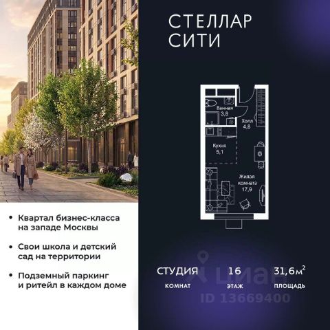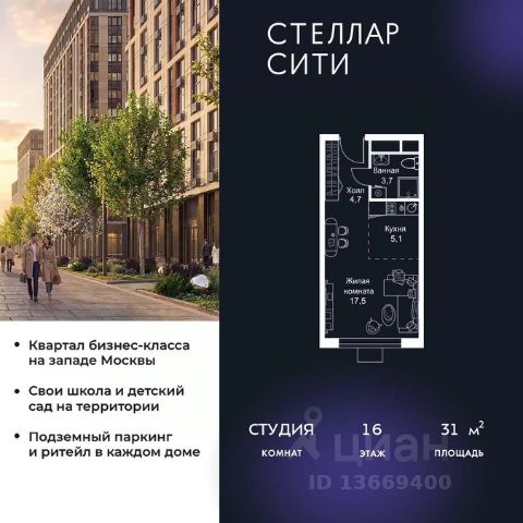 Прямая продажа от застройщика. В ЖК Сет продается студия площадью 31.84 м², расположенная в корпусе А, на 16 этаже 52 этажного дома. Сет имеет стратегически выгодное расположение в ЗАО, в районе с большой историей и блестящим будущим: между природной зоной долины реки Сетунь и Кутузовским проспектом. В рамках возведения первой очереди предусмотрено три корпуса высотой 18, 45 и 59 этажей. На верхних этажах спроектированы общедоступные смотровые площадки с панорамным обзором на центр столицы. Преимущества проекта: • Функциональные планировочные решения • Контроль проникновения через входную дверь • Система управления освещением и температурой в квартире • Система защиты от протечек с функцией перекрытия воды • Вход в подъезд по биометрическим считывателям Face ID • Скоростные лифты • Двухуровневый подземный охраняемый паркинг на 495 машино-мест Застройка Сет включает в себя не только жилые корпуса, но и инфраструктурные объекты. Все необходимое для повседневного комфорта будет расположено в шаговой доступности: • Фитнес-Клуб с бассейном • Ведущая городская школа, детский сад и школа искусств • Центр культуры и досуга • Медицинский центр • Кафе и рестораны Расположение комплекса: Пешком: • Метро "Давыдково" - 17 минут • Парк "Долина реки Сетунь" - 3 минуты • Открытие новых станций метро в шаговой доступности в будущем Инфраструктура: Разнообразить свой день резиденты Веер смогут также проводя больше времени на свежем воздухе. Двор разделен на 4 зоны разных эмоций и действий, которые пересечены и соединены веерными прогулочными маршрутами: • Спортивная площадка устроена в глубине "Кленовой рощи" • В "Чайном домике" будет создан навес с утеплением для отдыха в любую погоду • Площадки для детей воплотятся в "Волшебный лес" с цветами, зеркалами и световым дизайном • "Центральная площадь" устроена у водного оазиса живописного пруда. На машине: • "Москва-Сити" - 15 минут • Садовое кольцо - 20 минут • ТЦ "Океания" - 8 минут • ТЦ "Времена года" - 13 минут • Сколково - 12 минут • Гребной канал - 17 минут Компания MR предлагает своим клиентам специальные условия приобретения квартир в рамках программ ипотечного кредитования от банков-партнеров.