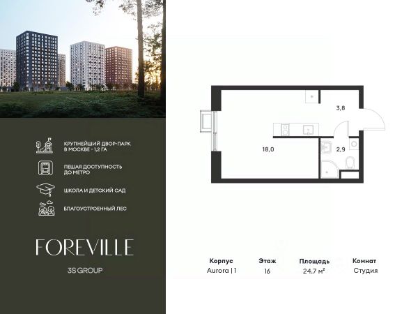 Предчистовая отделка в подарок! Пешая доступность от метро и московская прописка! Продается уютная студия площадью 21,3 кв.м на 16 этаже 17 этажного жилого комплекса бизнес-класса Foreville от 3S Group. Общая площадь: 21,3 кв.м., жилая: 7,3 кв.м., площадь кухни-гостиной: 6,3 кв.м., высота потолков: 3 м., окна выходят во двор. Квартира предлагается без отделки, что идеально подходит для воплощения собственного дизайнерского решения. Также доступна опция предчистовой отделки, стоимость которой включается в общую цену квартиры. О проекте: Пространство Комплекс располагает крупнейшим приватным двор-парком в Новой Москве площадью 1,2 Га, предлагая жителям огромное пространство для отдыха, спорта и игр на свежем воздухе. Природный ландшафт Внутренний лесопарк с более чем 183 взрослыми деревьями и 10 320 цветущими кустарниками создает уникальную природную атмосферу для каждого времени года. Игровые и спортивные зоны Обширные площадки с безопасным покрытием, специализированные зоны для детей разных возрастных групп и взрослых, включая воркаут и настольный теннис, способствуют активному и здоровому образу жизни. Экологичность и долговечность Использование натуральных материалов, таких как лиственница, и крупноформатной бетонной плитки для покрытия, подчеркивает стремление проекта к экологичности и устойчивости. Безопасность и уединение Внутренний двор без машин обеспечивает безопасность для детей и спокойствие для взрослых. Территория огорожена и находится под круглосуточным видеонаблюдением. Сохранение времени Благодаря превосходной транспортной доступности и близости к новой станции метро Корниловская, Foreville позволяет жителям экономить время для семьи и отдыха на природе, минимизируя необходимость длительных поездок. Foreville не просто жилье, а целая экосистема для комфортной и гармоничной жизни на свежем воздухе, совмещая преимущества городской инфраструктуры и непосредственную близость к природе.