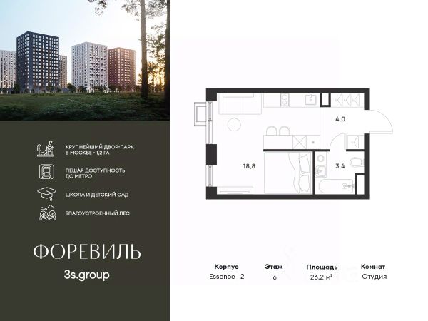 Предчистовая отделка в подарок! Пешая доступность от метро и московская прописка! Продается уютная студия площадью 24,7 кв.м на 16 этаже 17 этажного жилого комплекса бизнес-класса Foreville от 3S Group. Общая площадь: 24,7 кв.м., жилая: 12 кв.м., площадь кухни-гостиной: 6 кв.м., высота потолков: 3 м., окна выходят во двор. Квартира предлагается без отделки, что идеально подходит для воплощения собственного дизайнерского решения. Также доступна опция предчистовой отделки, стоимость которой включается в общую цену квартиры. О проекте: Пространство Комплекс располагает крупнейшим приватным двор-парком в Новой Москве площадью 1,2 Га, предлагая жителям огромное пространство для отдыха, спорта и игр на свежем воздухе. Природный ландшафт Внутренний лесопарк с более чем 183 взрослыми деревьями и 10 320 цветущими кустарниками создает уникальную природную атмосферу для каждого времени года. Игровые и спортивные зоны Обширные площадки с безопасным покрытием, специализированные зоны для детей разных возрастных групп и взрослых, включая воркаут и настольный теннис, способствуют активному и здоровому образу жизни. Экологичность и долговечность Использование натуральных материалов, таких как лиственница, и крупноформатной бетонной плитки для покрытия, подчеркивает стремление проекта к экологичности и устойчивости. Безопасность и уединение Внутренний двор без машин обеспечивает безопасность для детей и спокойствие для взрослых. Территория огорожена и находится под круглосуточным видеонаблюдением. Сохранение времени Благодаря превосходной транспортной доступности и близости к новой станции метро Корниловская, Foreville позволяет жителям экономить время для семьи и отдыха на природе, минимизируя необходимость длительных поездок. Foreville не просто жилье, а целая экосистема для комфортной и гармоничной жизни на свежем воздухе, совмещая преимущества городской инфраструктуры и непосредственную близость к природе.