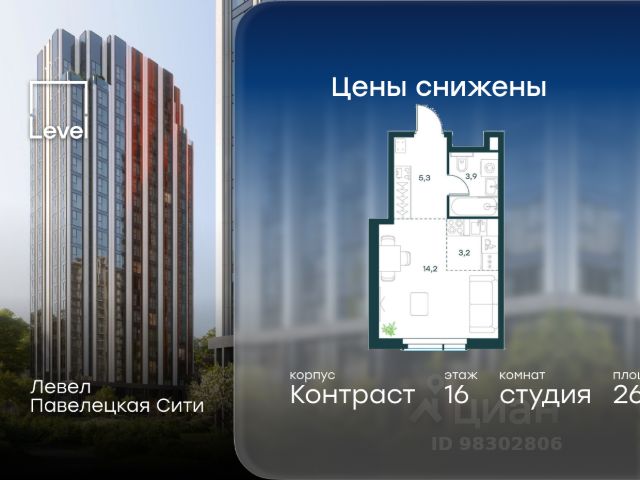 Цена указана с учётом скидки при 100%-й оплате, несубсидированной ипотеке, рассрочке (кроме программы "Рассрочка 0%"). В Даниловском районе столицы (ЮАО) продаётся студия площадью 26.60 кв.м без отделки. Квартира расположена на 16 этаже 27-этажного корпуса 14 в жилом комплексе бизнес-класса Левел Павелецкая Сити. Высота потолков 3.00м. Престижная локация Жилой комплекс бизнес-класса Левел Павелецкая Сити расположен в престижном Даниловском районе Москвы - историческом центре города в окружении парков, Москвы-реки и новейшей инфраструктуры. В 20 минутах пешком есть 3 станции метро, а в 5 минутах езды на авто - ТТК и Садовое кольцо. - 15 мин. пешком до метро "Павелецкая"; - 20 мин. пешком до станций "Тульская" и "Серпуховская"; - 8 мин. на авто до Кремля; - 10 мин. на авто до парка Горького и парка "Зарядье"; - 20 мин. на авто до башен "Москва-Сити". Авторская архитектура Авторская архитектура Авторская архитектурная концепция разработана бюро СПИЧ. Облик корпусов этапов 1 и 2 отсылает к стилистике архитектуры классического Нью-Йорка и золотой эпохи Голливуда. Корпуса этапа 4 вдохновлены эстетикой ар-деко. Умное линейное расположение корпусов гарантирует потрясающие виды на исторический центр и Москву-реку из большинства квартир. Дизайнерские лобби Изысканные интерьеры лобби жилого комплекса отсылают к классическим фильмам золотой эпохи Голливуда. Классика в жилом комплексе Левел Павелецкая Сити - не имитация, а современное осмысление лучшего в этом стиле. В каждом вестибюле оборудованы стойки ресепшен, комфортные зоны ожидания, гостевые санузлы, мойки для лап животных, колясочные. В корпусах по 3-4 лифта с прямым доступом в паркинг. Площадь лобби - от 47,9 до 114,9 кв. м, высота потолков - до 5,46 м. Благоустройство и инфраструктура Для создания благоустройства было приглашено 2 ведущих бюро - ADM и GAFA. Разноуровневое пространство вмещает в себя игровые площадки для детей всех возрастов, тропы здоровья для пеших прогулок, крытые аллеи с качелями, места для работы на свежем воздухе, многофункциональные спортивные площадки - зоны уличных тренировок, столы для пинг-понга, зоны командных игр. Общая площадь закрытого двора - 4,63 га. Комфорт - это когда рядом всё, что нужно для жизни. В жилом комплексе Левел Павелецкая Сити размещены 85 коммерческих помещений, где откроются супермаркеты, кафе, аптеки и многое другое. В составе проекта также предусмотрены собственный фитнес-клуб, развивающий центр Летово Кидс. Технологии и безопасность - Вайфай в лобби и на придомовой территории; - Автоматизированная система контроля и учета ресурсов; - Круглосуточное видеонаблюдение и охрана; - Круглосуточная связь с охраной через приложение, телефон или кол-центр; - Контроль доступа по биометрической системе распознавания лица; - Усиленный сотовый сигнал в лифтах и паркинге; - Распознавание номеров автомобилей при въезде/выезде в/из паркинга.