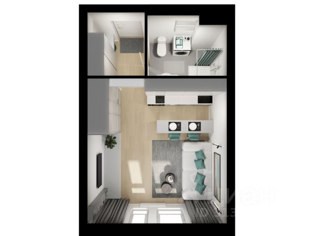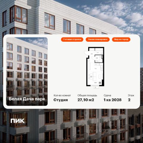 Общая площадь: 24.20 м.кв., Жилая площадь: 19.00 м.кв., Площадь кухни: 4.00 м.кв.