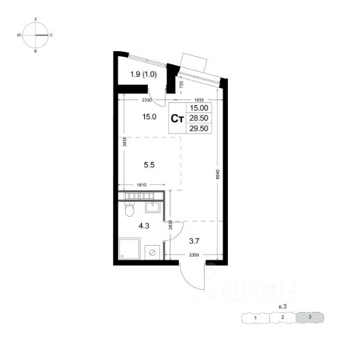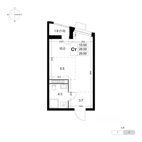 Общая площадь: 24.20 м.кв., Жилая площадь: 19.00 м.кв., Площадь кухни: 4.00 м.кв.