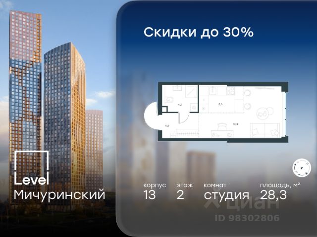 Цена указана с учётом скидки при 100%-й оплате, несубсидированной ипотеке, рассрочке (кроме программы "Рассрочка 0%"). В жилом квартале, расположенном на границе с природным заказником "Долина реки Очаковки", продаётся студия площадью 22.30 кв.м без отделки. Квартира расположена на 2 этаже 24-этажного корпуса 7 в жилом комплексе бизнес-класса Level Мичуринский (компания Level Group/Левел групп). Отличная транспортная доступность - 10 мин. пешком до станции метро "Мичуринский проспект" - 15 мин. пешком до станции метро "Аминьевская" - 7 мин. на авто до МКАД - 10 мин. на авто до ТТК - 15 мин. на авто до Москва-Сити Продуманный архитектурный проект - Выразительная архитектура от известных бюро: корпуса 1-6 - СПИЧ, корпуса 7-13 - Borisov Architects; - Из окон открываются живописные виды на парки, Москва-Сити и МГУ; - Высокие потолки до 6,35 м; - Стильные лобби с окнами в пол и высокими потолками до 4,7 м; - С каждого этажа дома на лифте можно спуститься в подземный отапливаемый паркинг. Расположение Level Мичуринский строится в одном из самых зеленых районов Москвы - Очаково-Матвеевское. Этот уголок столицы идеален для поддержания здорового образа жизни. В шаговой доступности от проекта находятся заказник "Долина реки Очаковки" - 1 мин. пешком и Очаковский парк - 7 мин. пешком. На велосипеде можно добраться до таких парков, как "Событие", парк Олимпийской деревни, парк 50-летия Октября и парк Школьников. В 15-минутной доступности на авто расположено более 30 детских садов (из них 14 в пешей доступности), 32 школы (из них 13 в пешей доступности) и 14 вузов. В ближайшем окружении работает более 25 медицинских учреждений, 11 спортивных клубов и 22 продуктовых супермаркета. Внутренняя инфраструктура На территории жилого комплекса строится три детских сада и школа. На первых этажах домов откроется супермаркет, фитнес-центр, ресторан, кафе и другие сервисы. Подземные этажи займут паркинги: трехуровневые в этапах 1 и 2, одноуровневый в этапах 3 и 4. Преимущества проекта - 4,5 га благоустроенной территории с видовым мостом, уличным кинотеатром, зонами для тихого отдыха, работы, воркаута, площадки для петанка, футбола, настольного тенниса и пляжного волейбола; - Дизайнерские лобби с панорамным видом на двор, мойками для лап животных и комфортными зонами ожидания. - Безопасность жителей: круглосуточное видеонаблюдение всех зон общего пользования (лобби, лифты, паркинги, детские площадки), система контроля доступа, управление видеодомофоном через мобильное приложение, единый ключ доступа на территорию жилого комплекса. - Технологии и комфорт: высокоскоростной Wi-Fi в лобби и на придомовой территории, автоматическая система контроля и учета ресурсов, абонентская связь с консьержем, распознавание номеров автомобилей при въезде/выезде в/из паркинга.