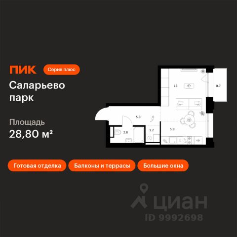 Продаётся квартира-студия площадью 28,8 кв.м на 2 этаже 24 этажного дома (Корпус 82.8, Секция 8) проекта ПИК Саларьево парк. Светлый просторный подъезд на уровне земли, функциональная планировка, большие окна, c отделкой. Жилой район "Саларьево парк" расположен в Новой Москве, в четырёх километрах от МКАД по Киевскому шоссе. Две станции метро: "Саларьево" и "Филатов луг", — находятся в пешей доступности от проекта. Дойти до них можно за 510 минут. В квартале уже создана качественная среда, где есть абсолютно всё для полноценной жизни, работы и отдыха. Благодаря удобному расположению проекта всё важное будет рядом: детские сады, школы, кафе и рестораны, шопинг в торговых центрах, фитнес и даже аэропорт. Все корпуса в квартале гармонично сочетаются, образуя единую городскую среду. Между собой их объединяет невысокая этажность и натуральная цветовая гамма. Здесь приятно гулять и проводить время на улице всей семьёй. В "Саларьево парке" создана уникальная образовательная среда, включающая в себя шесть школ, рассчитанных на 6 250 учеников. Две из них уже открыты, их посещает 2 300 детей. Также на территории "Саларьево парка" находится 12 детских садов, один из которых с бассейном. Сейчас уже открыты 7 садов. В "Саларьево парке" открыта уникальная игровая площадка — PlayHub "Оригами". Здесь есть ручей, горка-труба и рельефные холмы. Взрослые смогут отдохнуть в уютном кафе, пока дети играют. Также на территории проекта есть SportHub — большая спортивная зона, разделённая по интересам и возрастам. Здесь можно заниматься разными видами спорта: футболом, баскетболом, волейболом и стритболом. Зимой центральную часть площадки превращают в каток. Во дворах-парках жилого квартала есть места для отдыха, детские и спортивные площадки. На первых этажах домов расположены магазины, кафе и полезные сервисы. Также вблизи проекта есть несколько масштабных торговых центров. До ТЦ "Саларис" пять минут пешком, до "Рио", Metro Cash & Carry и "Леруа Мерлен" — пять минут на автомобиле. Артикул 1033128 (Застройщик ООО "Специализированный Застройщик "Тирон")