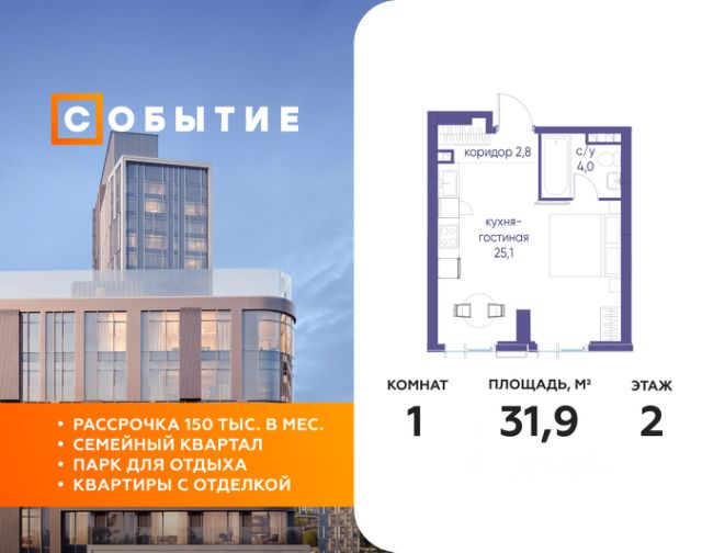 В продаже студия от застройщика. Общая площадь 31.90, жилая 17.20, кухня 7.9. Квартира расположена на 2 этаже жилого квартала "Событие-6", корпус 2, 5. Квартира без отделки. Срок сдачи: 4 кв. 2029 года. СОБЫТИЕ.6 — финальный дом парк-квартала СОБЫТИЕ на Мосфильмовской. Переезжайте в уже сформированный квартал с готовой инфраструктурой и парком! Премиальный жилой комплекс в престижном районе Москвы предлагает стильную архитектуру, продуманное благоустройство и великолепно разнообразие общественных пространств. Свой парк прямо возле дома! Архитектура Архитектура СОБЫТИЯ.6 выполнена в ультрасовременном стиле московским бюро Atrium на основе дизайн-кода британских архитекторов LDA Design и UHA London. Дом отличает оригинальная геометрия фасадов, большое остекление и высокие лобби (до 6,2 м) с авторской мебелью и светильниками. Расположение Мосфильмовская улица (Раменки) — один из престижных районов Москвы. Близость к историческому и деловому центру, природным зонам Запада столицы. Транспортная доступность: • 10 мин до Москва-Сити и ТТК; • 15 мин до Садового кольца; • 25 мин до аэропорта Внуково; • 7-10 мин до станций метро "Аминьевская" и "Мичуринский проспект". Инфраструктура: • парк "Событие" (12 га, финалист конкурса Правительства Москвы) с беговыми (1,5 км) и велодорожками (2,7 км), экотропой (1,6 км), площадками, лекторием; • школа, детский сад, магазины, салоны красоты, рестораны (к моменту заселения); • мультидвор с игровыми и спортивными площадками, мини-бульваром; • общественная терраса на 10-м этаже (коворкинг, лаунж); • Закрытые общественные пространства: детская комната, спортивный зал, коворкинг, лаунж-зоны. Паркинг 256 мест для жителей (48 — для электромобилей), 24 гостевых (5 — для электромобилей), мойки колес, кладовые, зоны для велосипедов. Окружение Парки и заповедники (Воробьёвы горы, Матвеевский лес и др.), МГУ, театр им. Н. И. Сац, стадион "Лужники". Безопасность Видеонаблюдение, контроль доступа, видеодомофоны, консьерж-сервис 24/7, системы пожарной безопасности и мультисервисная оптическая сеть.