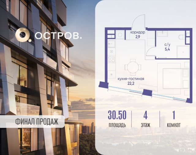 Продаётся квартира от застройщика: общая площадь 30.50 м², жилая 17.20 м², кухня 5.00 м², 4-й этаж, жилой квартал "Остров 12", корпус 2 (секция 1). Срок сдачи: 1 квартал 2029 года. 1 совмещенный санузел. В жилой зоне 2 больших окна на одну сторону, хорошая инсоляция. Позвоните сейчас и забронируйте квартиру! ОСТРОВ от Донстрой - жилой комплекс на западе Москвы, в Мневниковской пойме. Уникальное преимущество комплекса - в том, что он обособлен от города рекой и природным парком (650 га). Благодаря природному окружению эта территория имеет лучший экологический рейтинг в столице. Кварталы ОСТРОВА объединены ландшафтным дизайном в единое пространство - с набережными и Центральным бульваром. На ОСТРОВЕ любые объекты, необходимые для полноценной жизни и отдыха, находятся на расстоянии 15-минутной прогулки. Торговый центр и супермаркеты, кафе и рестораны, фитнес, салоны красоты, школы и детские сады. А также крупнейший в Москве спортивный кластер.