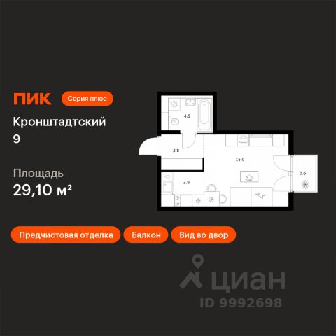 Продаётся квартира-студия площадью 29,1 кв.м на 4 этаже 12 этажного дома (Корпус 1.1.1, Секция 1) проекта ПИК Кронштадтский 9. Светлый просторный подъезд на уровне земли, функциональная планировка, большие окна, предчистовая отделка.