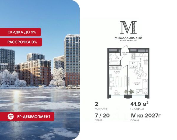 Скидка 9% при покупке квартиры! Продаётся студия 29,0 кв.м. в ЖК "Михалковский" на 4-м этаже 20 этажного дома. Ипотека для каждого! Полная стоимость кредита от 12,378% до 18,537%. Ставка от 0,11% в АО "Альфа-Банк", ген. лицензия ЦБ РФ 1326 от 16.01.2015. Ставка фиксируется на первые 12 месяцев, далее полная стоимость кредита от 22,025% до 24,935% ставка 21,59%. Первоначальный взнос — от 20,1% от стоимости квартиры. Срок кредитования — от 4 до 30 лет. Компания "РГ-Девелопмент" предоставляет скидку на квартиры в жилом комплексе. Акция действительна до 28.02.2026 включительно. Для того чтобы воспользоваться предложением, необходимо подписать договор на приобретение недвижимости до 28.02.2026 включительно. Действует программа "Растет семья - растет и квартира". Компания "РГ-Девелопмент" вошла в ТОП-10 девелоперов по объёму введённого жилья в "Старой Москве" по итогам 2025 года. Прямая продажа от застройщика! Квартиры без отделки. Срок сдачи IV кв. 2027г. Особенности проекта: Завораживающие виды Красивое благоустройство Уникальная локация для Москвы (рядом Головинский парк, пруды, усадьба Михалково) Рядом с центром В проекте присутствует: архитектура голландского бюро MLA+, зеленые зоны, транспортная доступность, благоустроенная территория, подземный паркинг, детский сад и выход на Головинский парк с пятью прудами. Название комплекса указывает на одну из его черт - соседство с имением Михалково. Позвольте себе жить в месте, где проводили свой досуг династии Дашковых и Паниных.