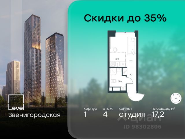 10 минут от Москва-Сити В продаже квартира площадью 34.94 м² без отделки на 4 этаже 46 этажного дома. Квартира расположена в корпусе Leo. JOIS это премиальный жилой комплекс от девелопера MR Group в районе Хорошёво-Мнёвники. Он включает несколько эффектных небоскрёбов высотой 47-56 этажей, эксклюзивные форматы квартир с панорамным остеклением, подземный двухуровневый паркинг на 239 м/м, собственную приватную инфраструктуру, закрытый ландшафтный парк 2,3 Га с функциональным зонированием и охраняемой территорией. Над проектом работали лучшие команды международных агентств с многолетним опытом: Genpro, S&P, iLight International и другие. Расположение Пешком: - 5 мин. ст. МЦК "Хорошёво"; - 15 мин. ст. м. "Народное ополчение"; - 10 мин. ст. метро "Звенигородская" с 2027 года; - 20 мин. причал "Карамышевский". На автомобиле: - 3 мин. до Звенигородского шоссе; - 5 мин. до ТТК: - 8 мин. до Серебряного бора и Строгинского затона - 10 мин. до ММДЦ "Москва-Сити"; - 40 мин. до аэропорта "Шереметьево"; Благоустройство - собственный ландшафтный парк 2,3 Га; - парк скульптур от Cosmoscow; - консьерж-сервис 24/7; - сервисный лифт и вход; - игровые и спортивные площадки; - коворкинг с библиотекой; - лаунж-зона с камином; - игровые комнаты для детей и клуб для подростков с оборудованием для видеоигр; - спортивная студия для индивидуальных тренировок; - гостиная с мини-кухней; - зоны для выгула собак; - подогрев пешеходных дорожек в зимний период; - автополив зелёных насаждений; - премиальные рестораны, кафе, химчистки, аптеки и супермаркеты. Окружение - 4 парка: Покровское-Стрешнево, Филёвский парк, Серебряный бор и Берёзовая роща; - 15 общеобразовательных заведений, в том числе две школы из самых лучших в Москве: государственная школа "Интеграл" и частная "Хорошкола"; - спортивное сооружение "ВЭБ Арена", домашний стадион ФК ЦСКА; - крупнейший в Европе торгово-развлекательный центр "Авиапарк".