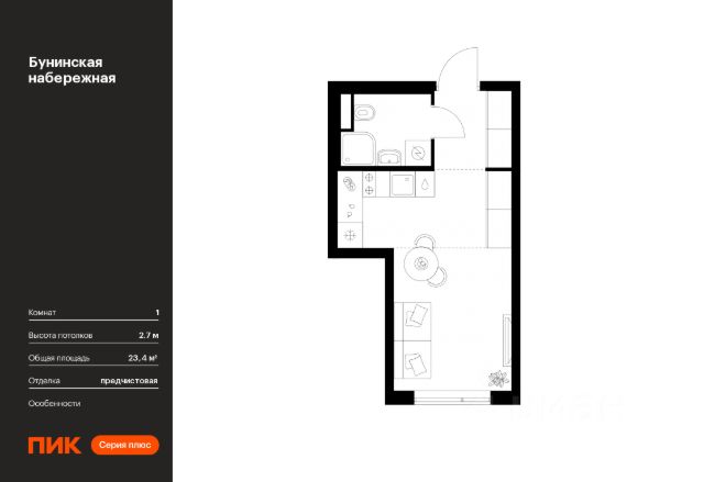 Продаётся квартира-студия площадью 23,4 кв.м на 5 этаже 16 этажного дома (Корпус 2.6/1.2, Секция 2) проекта ПИК Бунинская набережная. Светлый просторный подъезд на уровне земли, функциональная планировка, большие окна, предчистовая отделка. Удобное расположение: 18 минут пешком от м. "Потапово" и 12 минут на автомобиле до станции "Бунинская аллея". 12 минут на автомобиле до трассы Солнцево — Бутово — Варшавское шоссе. 20 минут на автомобиле до МКАД и Калужского шоссе. 1520 минут езды до живописных парков: "Бутовский лесопарк", заказник "Южное Бутово". Особенности проекта Камерный квартал в Новой Москве, на берегу Ивановского пруда. Одна из ключевых особенностей проекта — квартиры с панорамным видом на воду. Архитекторы вдохновились локацией проекта: природные оттенки и активная пластика корпусов напоминают рельефные выступы на берегу, а окна отражают водную гладь, визуально объединяя дома с природой. Преимущества проекта Светлые и просторные лобби с зонами ожидания. Подземный паркинг. Набережная и пешеходная аллея для прогулок. Парк на склоне с игровой зоной. Готовая инфраструктура района: 3 школы, 6 детских садов, взрослая и детская поликлиники. Артикул 968501 (Застройщик ООО СЗ "Стройком")