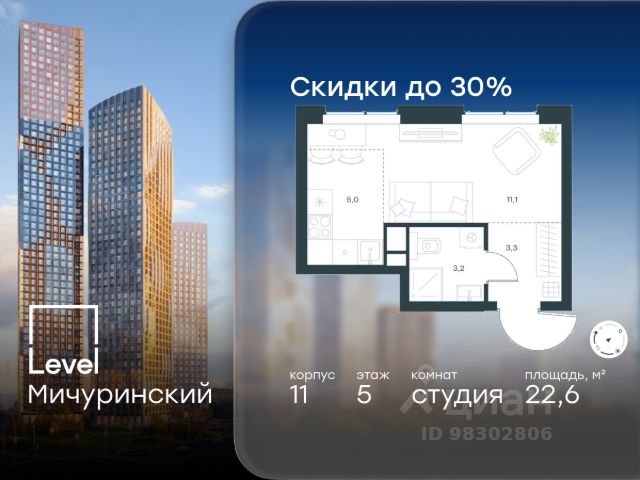 Цена указана с учётом скидки при 100%-й оплате, несубсидированной ипотеке, рассрочке (кроме программы "Рассрочка 0%"). В жилом квартале, расположенном на границе с природным заказником "Долина реки Очаковки", продаётся студия площадью 28.00 кв.м без отделки. Квартира расположена на 5 этаже 31-этажного корпуса 13 в жилом комплексе бизнес-класса Level Мичуринский (компания Level Group/Левел групп). Отличная транспортная доступность: - от 10 мин. пешком до станции метро "Мичуринский проспект" - 15 мин. пешком до станции метро "Аминьевская" - 7 мин. на авто до МКАД - 10 мин. на авто до ТТК - 15 мин. на авто до Москва-Сити Продуманный архитектурный проект: - Выразительная архитектура от известных бюро: корпуса 1-6 - СПИЧ, корпуса 7-13 - Borisov Architects; - Из окон открываются живописные виды на парки, Москва-Сити и МГУ; - Высокие потолки до 6,35 м; - Стильные лобби с окнами в пол и высокими потолками до 4,7 м; - С каждого этажа дома на лифте можно спуститься в подземный отапливаемый паркинг. Расположение: Level Мичуринский строится в одном из самых зелёных районов Москвы - Очаково-Матвеевское. Этот уголок столицы идеален для поддержания здорового образа жизни. В шаговой доступности от проекта находятся заказник "Долина реки Очаковки" - 1 мин. пешком и Очаковский парк - 7 мин. пешком. На велосипеде можно добраться до таких парков, как "Событие", парк Олимпийской деревни, парк 50-летия Октября и парк Школьников. В 15 минутах езды на авто расположено более 30 детских садов (из них 14 в пешей доступности), 32 школы (из них 13 в пешей доступности) и 14 вузов. Также в ближайшем окружении - более 25 медицинских учреждений, 11 спортивных клубов и 22 продуктовых супермаркета. Внутренняя инфраструктура: На территории жилого комплекса строится три детских сада и школа. На первых этажах домов откроется супермаркет, фитнес-центр, ресторан, кафе и другие сервисы. Подземные этажи займут паркинги: трёхуровневые - в этапах 1 и 2, одноуровневый - в этапах 3 и 4. Преимущества проекта: - 4,5 га благоустроенной территории с видовым мостом, уличным кинотеатром, зонами для тихого отдыха, работы, воркаута, площадки для петанка, футбола, настольного тенниса и пляжного волейбола. - Дизайнерские лобби с панорамным видом на двор, мойками для лап животных и комфортными зонами ожидания. - Безопасность жителей: круглосуточное видеонаблюдение всех зон общего пользования (лобби, лифты, паркинги, детские площадки), система контроля доступа, управление видеодомофоном через мобильное приложение, единый ключ доступа на территорию жилого комплекса. - Технологии и комфорт: высокоскоростной Wi-Fi в лобби и на придомовой территории, автоматическая система контроля и учёта ресурсов, абонентская связь с консьержем, распознавание номеров автомобилей при въезде в паркинг и выезде из него.