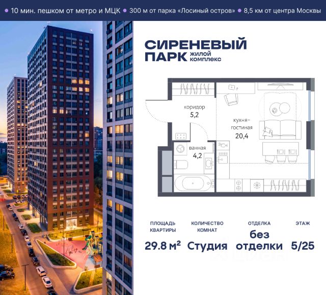 Продается студия в ЖК "НАЗАРЕ'" Общая площадь - 23.90 Тип дома - монолитный Этаж - 5 Год сдачи - 2028 Предлагается квартира площадью 23.90 кв. м в новом современном квартале на востоке Москвы, прямо у станций метро и МЦК "Бульвар Рокоссовского". Квартира располагается в корпусе 2 на 5 этаже комплекса бизнес-класса "НАЗАРЕ'". Великолепная транспортная доступность: • 2 минуты ходьбы до метро и МЦК "Бульвар Рокоссовского"; • 3 минуты на авто - удобный выезд на СВХ (МСД); • 10 минут на авто до национального парка "Лосиный остров"; • 10 минут на авто до "Измайловского парка"; • 15 минут до авто до парка "Сокольники"; • 15 минут занимает выезд на ТТК, • 18 минут на авто до Садового кольца. Индивидуальная архитектура в современном стиле: • шесть башен переменной высотности от 24 до 43 этажей, в том числе одна высотная 143-метровая доминанта, которая станет достопримечательностью востока Москвы; • авторы архитектурной концепции - знаменитое бюро СПИЧ (среди их работ - башня "Федерация", новое здание Третьяковской галереи, реконструкция БСА "Лужники" и др.); • торгово-развлекательный комплекс с фитнес-центром, детской игровой комнатой и открытыми террасами прямо возле квартала; • дизайнерские лобби от бюро ABOVE ARCHITECTURE с панорамными окнами, интерьерами в теплой цветовой гамме и мягкой зоной ожидания располагаются в каждой башне; • корпуса расположены так, чтобы из окон открывались потрясающие виды на закаты и рассветы, зеленые панорамы или огни мегаполиса; Особенности расположения "НАЗАРЕ'" находится максимально близко к метро, и в то же время проект вписан в уже существующую инфраструктуру зеленого столичного района Богородское. Это обеспечивает быстрый доступ ко всем нужным объектам инфраструктуры (детские сады, школы, медцентры, магазины, салоны красоты, фитнес-клубы, футбольные поля, спортивные школы), а также к живописным зеленым зонам - национальному парку "Лосиный остров", парку "Сокольники", Черкизовскому детскому парку, Измайловскому лесопарку с усадьбой Измайлово. Собственная инфраструктура и благоустройство Шесть башен квартала будут объединены цокольным этажом, в который можно попасть как с улицы, так и со стороны лобби. Здесь разместятся необходимые для комфортной повседневной жизни кофейни, супермаркет, рестораны, магазины и многое другое. В комплексе предусмотрен вместительный двухуровневый подземный паркинг с келлерами для хранения сезонных вещей. Во дворе комплекса "НАЗАРЕ'" будут места как для спокойного отдыха и работы, так и для игр и спорта. Здесь организованы игровые площадки для детей всех возврастов, места для стритбола и тенниса, а также зона с природным ландшафтом и коворкинг с экологичной деревянной мебелью.