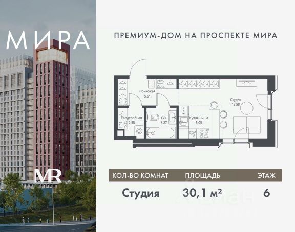 Прямая продажа от застройщика. Продаётся студия общей площадью 30.06 м² без отделки в доме премиум-класса МИРА на 6-м этаже 23 этажного дома. Квартира расположена в корпусе 2. Дом премиум-класса МИРА это: • Спокойный район с богатой историей и сложившейся инфраструктурой • Авторская архитектура на стыке классики и современности • Вход в парк прямо из жилого комплекса • Панорамные виды на Яузу, парки, ВДНХ и скульптуру "Рабочий и колхозница" • Удобные сервисы и безопасность для каждого резидента Расположение: Жилой квартал расположен в Алексеевском районе на северо-востоке Москвы, на второй линии домов, таким образом вы сможете дистанцироваться от шума и суеты проспекта Мира, но при этом будете жить недалеко от этой важной городской магистрали. Прямо у дома: • Парк Акведук • Река Яуза • Памятник "Рабочий и колхозница" Пешком: • 16 мин м. ВДНХ На автомобиле: • 12 мин ТТК • 15 мин Садовое кольцо • 12 мин Национальный парк "Лосиный остров" Благоустройство: Концепция благоустройства от бюро "ДРУЖБА" разработана в стиле "Лесная тропа". В уютном дворе расположились словно затерянные в лесу, площадки для отдыха. Они разделяются островками с травами, кустарниками, крупными камнями и деревьями, между которыми проходят узкие песчаные тропинки с деликатной подсветкой по вечерам. Центральной точкой притяжения для жителей станет главная площадь с фонтаном, которая открывается сразу из двух входных групп. Внутренний двор МИРА: • Детская площадка с зонами для игр малышей до трех лет и детей более старшего возраста • Спортивная площадка с профессиональным оборудованием для тренировок • Декоративные перголы • Воздушный арт-объект с подсветкой, похожий на облако • Чайный домик, где в отдельном отапливаемом павильоне можно в любое время года попить кофе с соседями или устроить камерное семейное чаепитие • Зоны для работы и отдыха с гамаком под навесом, скамейками и креслами Инфраструктура и окружение: В Алексеевском районе есть огромные благоустроенные парки, магазины, гимназии с высоким рейтингом и филиалы ВУЗов, частные и государственные детские сады, модные кофейни и фитнес-центры. В квартале МИРА предусмотрены: • 2 ресторана с видом на парк Акведук • 3 кафе • фитнес-студия • подземный паркинг на 330 машино-мест Компания MR предлагает своим клиентам специальные условия приобретения квартир в рамках программ ипотечного кредитования от банков-партнеров.