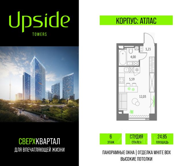 Продаётся студия площадью 24.85 кв.м на 6 этаже 47 этажного корпуса Атлас в квартале небоскребов "Upside Towers". В квартире отделка White-box, c видом на внутренний двор, ландшафтный парк. Номер квартиры Б0611. Upside Towers - технологичный квартал строится в динамично развивающемся Бутырском районе, в 3 мин. от метро, в 5 мин. от ТТК. На территории 7 га возводится 5 высотных башен от 19 до 58 этажей, названных в честь главных вершин земли. Квартиры с панорамными окнами в пол, высокими потолками и современными инженерными решениями. Благоустроенная зеленая территория включает: приватные дворы, природный комплекс, прогулочный бульвар, ландшафтный парк 2,5 га с сенсорным садом и многофункциональными игровыми и спортивными площадками. В корпусе откроются магазины, кафе и рестораны, а также другие объекты коммерческой инфраструктуры. На последнем этаже корпуса предусмотрен SPA Relax центр с панорамным видом на город. Собственники квартир смогут в любое удобное для них время забронировать посещение спа-зоны через смарт-приложение. Дня них будут доступны джакузи, пространства для занятий йогой, а также места для отдыха и релаксации. Большое внимание в проекте уделяется созданию социальной инфраструктуры. Между "Атласом" и "Олимпом" в трехэтажном стилобате разместится уникальное пространство закрытый клуб для жителей квартала Upside Club площадью 2 000 кв. м. Здесь появится каминный зал с роялем, многофункциональная детская зона c двухуровневым игровым оборудованием для малышей и дошкольников, плей-рум для подростков, домашний кинотеатр, коворкинг, переговорные и лектории. На крыше стилобата разместится всесезонная BBQ патио-зона с верандой и закрытыми помещениями для приготовления и отдыха. В башнях откроются смотровые террасы для резидентов с панорамными видами на город, парки, Останкинскую башню, ВДНХ, Ботанический сад и Москва-Сити. Покупая квартиру даже самого минимального размера в Upside Towers, вы получаете в пользование 2 000 м² бесплатных общественных пространств. В рамках проекта строится государственная школа и детский сад, разместится более 15 000 кв.м. коммерческой инфраструктуры. Насыщенная социальная инфраструктура формирует множество сценариев для жизни на территории квартала. В Upside Towers применяются лучшие технологии и практики, чтобы обеспечить высшее качество жизни: Воздух, не уступающий по качеству горному, обеспечит приточно-вытяжная вентиляция. Пятиступенчатая очистка воды с сохранением полезных минералов. Центральное кондиционирование. Внутрипольные конвекторы с естественной конвекцией. Современные системы безопасности и мониторинга микроклимата. Высокоскоростной интернет на всей территории, в квартирах и паркинге за счет усиления GSM-связи всех ведущих операторов. Все места в подземном паркинге оборудованы зарядками для электрокаров. Бутырский район непрерывно развивается и готовится стать новым современным деловым районом Москвы. В рамках программы "Индустриальные кварталы" комплексного развития территории О