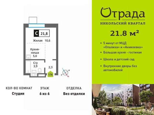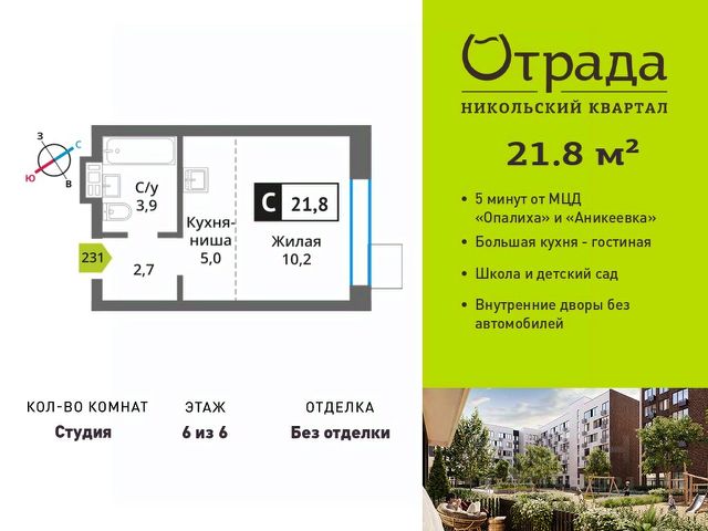 Продается студия 21,8 кв.м. расположенная на 6-ом этаже с прекрасным видом, высота потолков 3 м. Право собственности на основании ДДУ 1 собственник, мат капитал не использован при покупке , ДОМ СДАН Быстрый выход на сделку по ДКП. Никольский квартал Отрада новый жилой комплекс в Красногорске, в микрорайоне Опалиха. Квартал расположен в удачной локации, которая сочетает благоприятную экологическую обстановку с прекрасной транспортной доступностью. До МЦД "Опалиха" и "Аникеевка" можно будет добраться на автомобиле всего за 4-5 минут. Проектом предусмотрены 14 корпусов средней этажности 6-9 этажей, а также муниципальная школа, один муниципальный и один частный детский сад, два наземных многоуровневых паркинга с кладовыми помещениями. Все планировки выполнены по современным стандартам и отличаются повышенным комфортом. Для самых требовательных клиентов в проекте есть квартиры формата Лаунж Флэт с потолками до 3,9 м. и собственными террасами-патио.